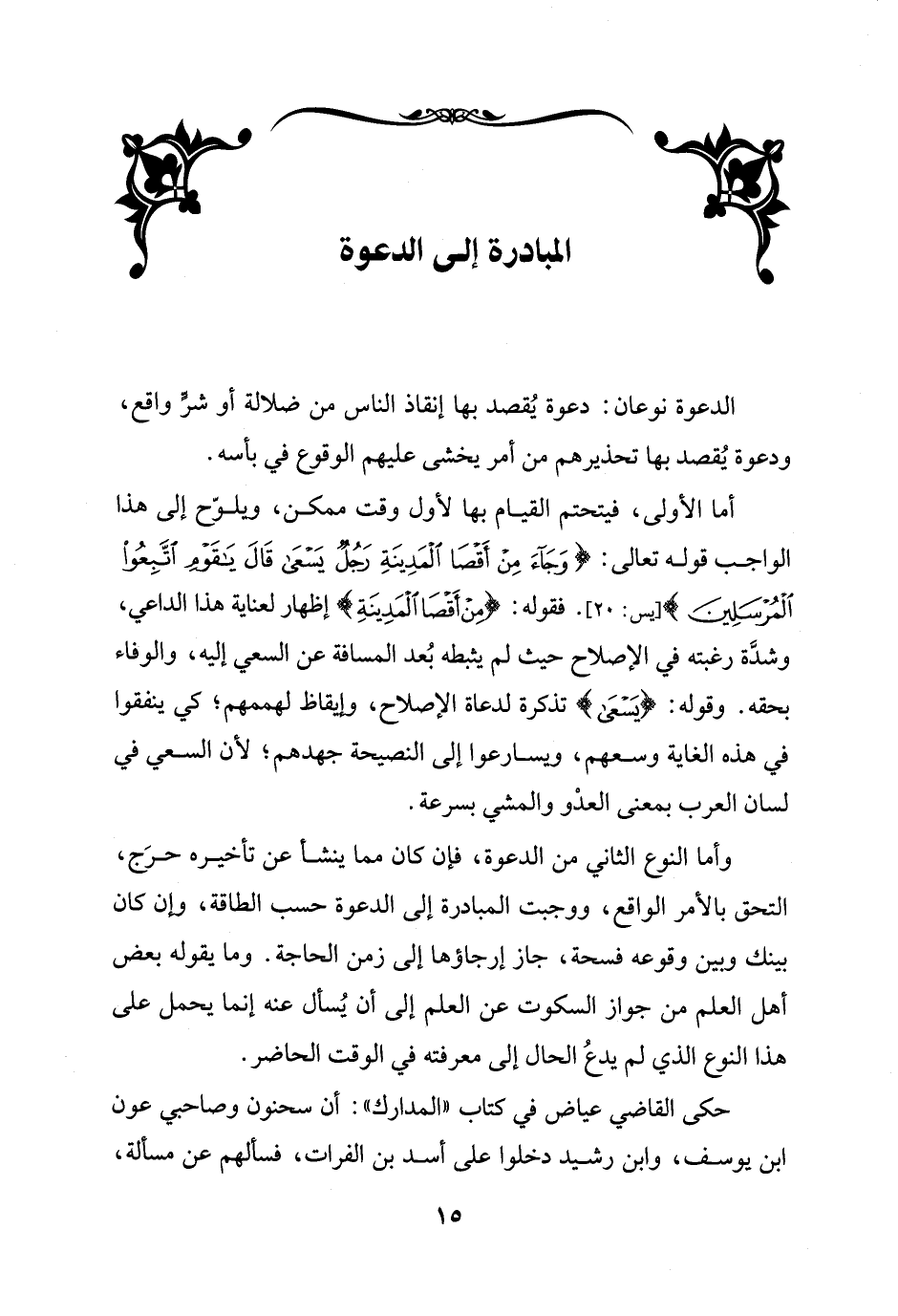 أما الأولى، فيتحتم القيام بهالأول وقت ممكن، ويلوّح إلى هذا الواجب قوله تعالى: {وَجَاءَ مِنْ أَقْصَى الْمَدِينَةِ رَجُلٌ يَسْعَى قَالَ يَاقَوْمِ اتَّبِعُوا الْمُرْسَلِينَ} [يس: 20]. فقوله: {مِنْ أَقْصَى الْمَدِينَةِ} إظهار لعناية هذا الداعي، وشدَّة رغبته في الإصلاح حيث لم يثبطه بُعد المسافة عن السعي إليه، والوفاء بحقه. وقوله: {يَسْعَى} تذكرة لدعاة الإصلاح، وإيقاظ لهممهم؛ كي ينفقوا في هذه الغاية وسعهم، ويسارعوا إلى النصيحة جهدهم؛ لأن السعي في لسان العرب بمعنى العدْو والمشي بسرعة.