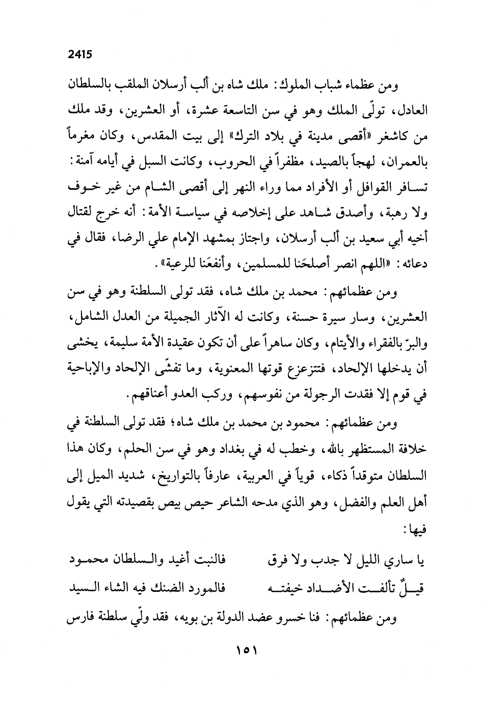 ومن عظمائهم: محمد بن ملك شاه، فقد تولى السلطنة وهو في سن العشرين، وسار سيرة حسنة، وكانت له الآثار الجميلة من العدل الشامل، والبرّ بالفقراء والأيتام، وكان ساهرًا على أن تكون عقيدة الأمة سليمة، يخشى أن يدخلها الإلحاد، فتتزعزع قوتها المعنوية، وما تفشّى الإلحاد والإباحية في قوم إلا فقلت الرجولة من نفوسهم، وركب العدو أعناقهم.