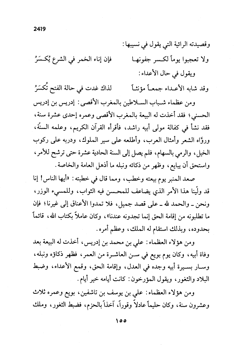ومن عظماء شباب السلاطين بالمغرب الأقصى: إدريس بن إدريس الحسني؛ فقد أخذت له البيعة بالمغرب الأقصى وعمره إحدى عشرة سنة، فقد نشأ في كفالة مولى أبيه راشد، فأقرأه القرآن الكريم، وعلمه السنّة، وروّاه الشعر وأمثال العرب، وأطلعه على سير الملوك، ودربه على ركوب الخيل، والرمي بالسهام، فلم يصل إلى السنة الحادية عشرة حتى ترشح للأمر، واستحق أن يبايع، وظهر من ذكائه ونبله ما أذهل العامة والخاصة.