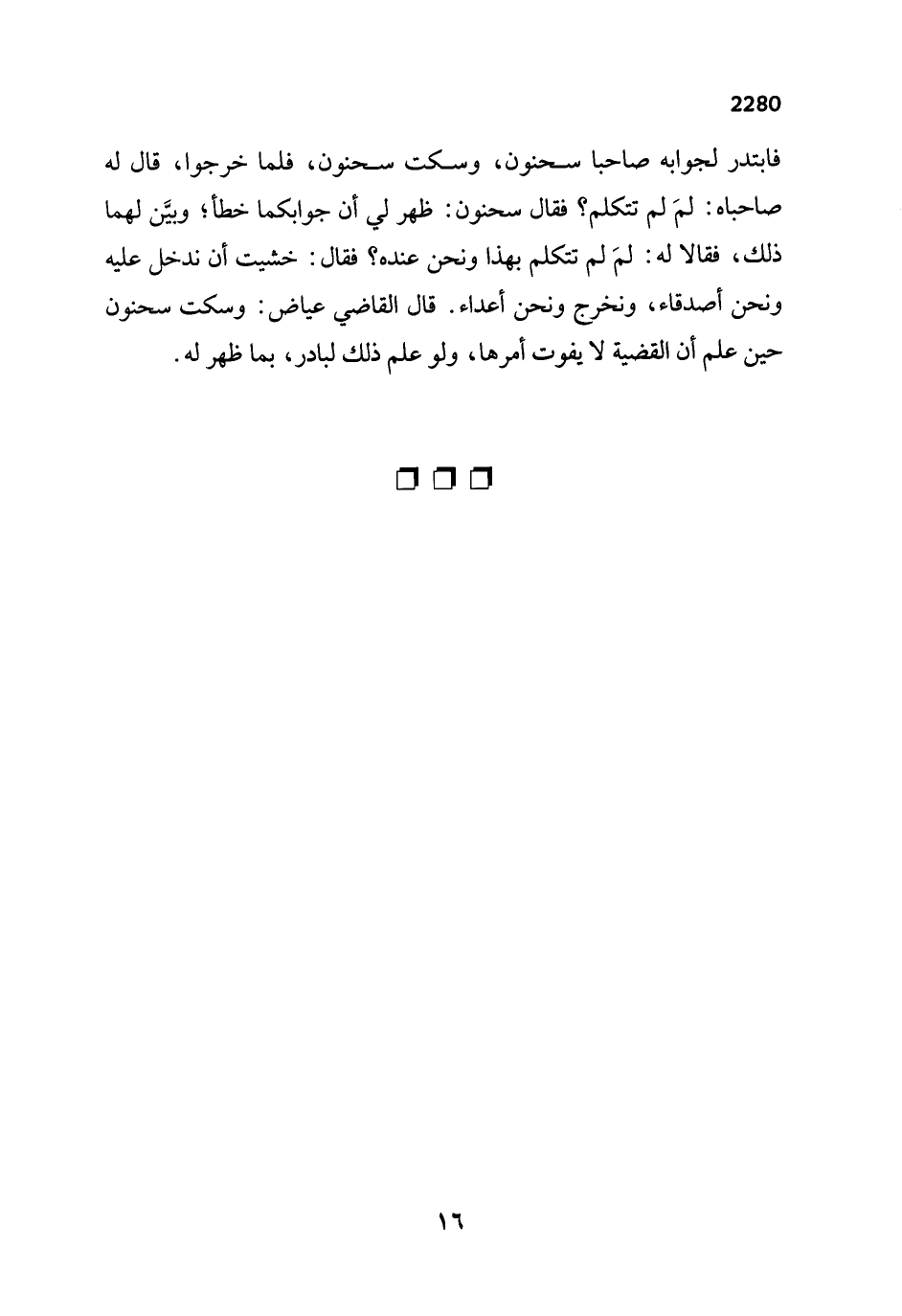 فابتدر لجوابه صاحبا سحنون، وسكت سحنون، فلما خرجوا، قال له صاحباه: لمَ لم تتكلم؟ فقال سحنون: ظهر في أن جوابكما خطأ؛ وبيَّن لهما ذلك، فقالا له: لمَ لم تتكلم بهذا ونحن عنده؟ فقال: خشيت أن ندخل عليه ونحن أصدقاء، ونخرج ونحن أعداء. قال القاضي عياض: وسكت سحنون حين علم أن القضية لا يفوت أمرها، ولو علم ذلك لبادر، بما ظهر له.