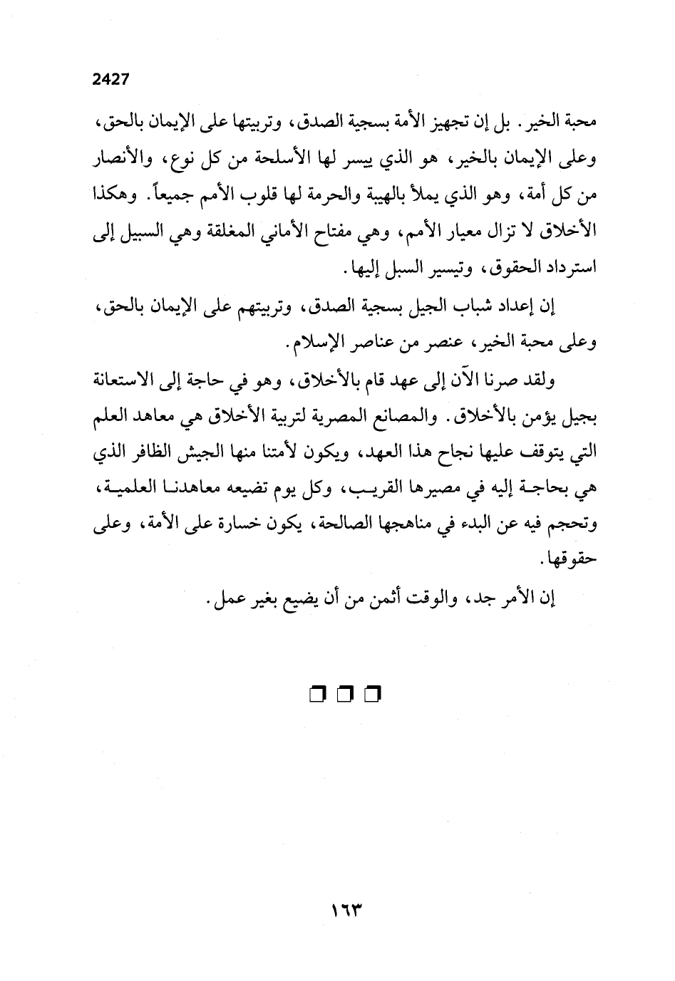 ولقد صرنا الآن إلى عهد قام بالأخلاق، وهو في حاجة إلى الاستعانة بجيل يؤمن بالأخلاق. والمصانع المصرية لتربية الأخلاق هي معاهد العلم التي يتوقف عليها نجاح هذا العهد، ويكون لأمتنا منها الجيش الظافر الذي هي بحاجة إليه في مصيرها القريب، وكل يوم تضيعه معاهدنا العلمية، وتحجم فيه عن البدء في مناهجها الصالحة، يكون خسارة على الأمة، وعلى حقوقها.