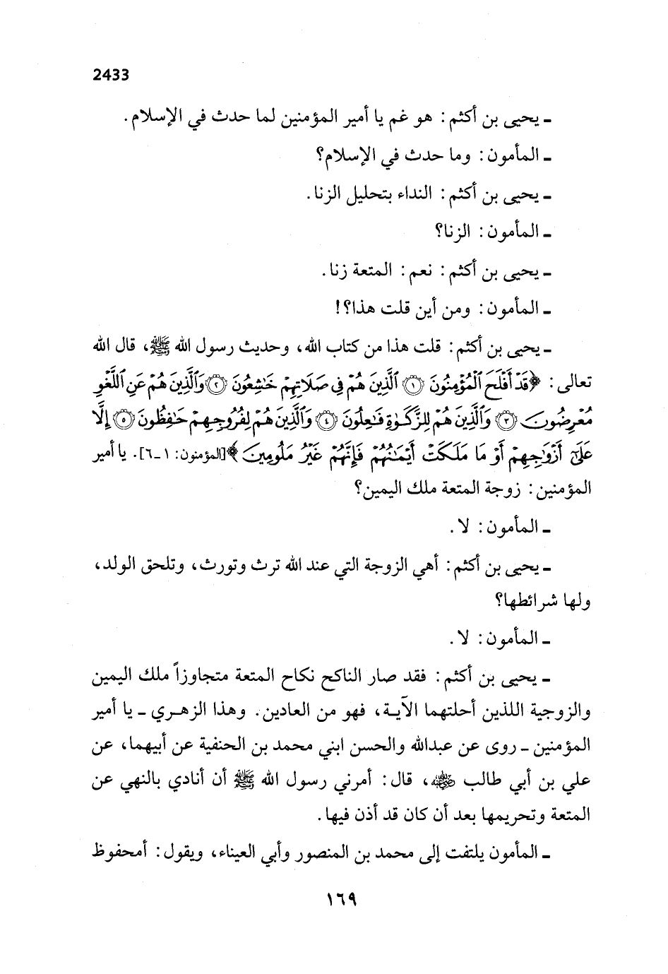 - يحيى بن أكثم: قلت هذا من كتاب الله، وحديث رسول الله - صلى الله عليه وسلم -، قال الله تعالى: {قَدْ أَفْلَحَ الْمُؤْمِنُونَ (1) الَّذِينَ هُمْ فِي صَلَاتِهِمْ خَاشِعُونَ (2) وَالَّذِينَ هُمْ عَنِ اللَّغْوِ مُعْرِضُونَ (3) وَالَّذِينَ هُمْ لِلزَّكَاةِ فَاعِلُونَ (4) وَالَّذِينَ هُمْ لِفُرُوجِهِمْ حَافِظُونَ (5) إِلَّا عَلَى أَزْوَاجِهِمْ أَوْ مَا مَلَكَتْ أَيْمَانُهُمْ فَإِنَّهُمْ غَيْرُ مَلُومِينَ} [المؤمنون: 1 - 6]. يا أمير المؤمنين: زوجة المتعة ملك اليمين؟