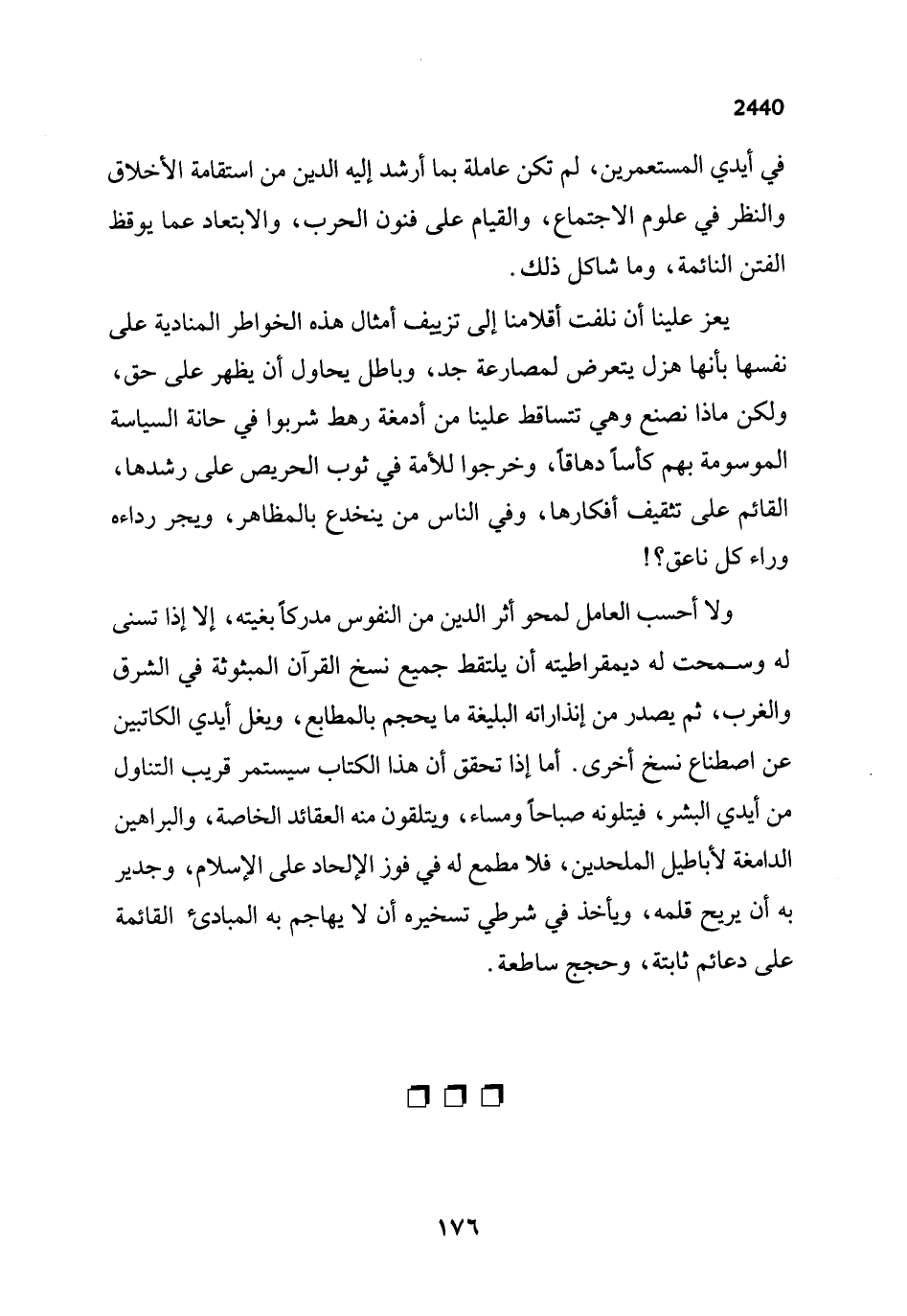ولا أحسب العامل لمحو أثر الدين من النفوس مدركاً بغيته، إلا إذا تسنى له وسمحت له ديمقراطيته أن يلتقط جميع نسخ القرآن المبثوثة في الشرق والغرب، ثم يصدر من إنذاراته البليغة ما يحجم بالمطابع، ويغل أيدي الكاتبين عن اصطناع نسخ أخرى. أما إذا تحقق أن هذا الكتاب سيستمر قريب التناول من أيدي البشر، فيتلونه صباحاً ومساء، ويتلقون منه العقائد الخاصة، والبراهين الدامغة لأباطيل الملحدين، فلا مطمع له في فوز الإلحاد على الإِسلام، وجدير به أن يريح قلمه، ويأخذ في شرطي تسخيره أن لا يهاجم به المبادئ القائمة على دعائم ثابتة، وحجج ساطعة.
