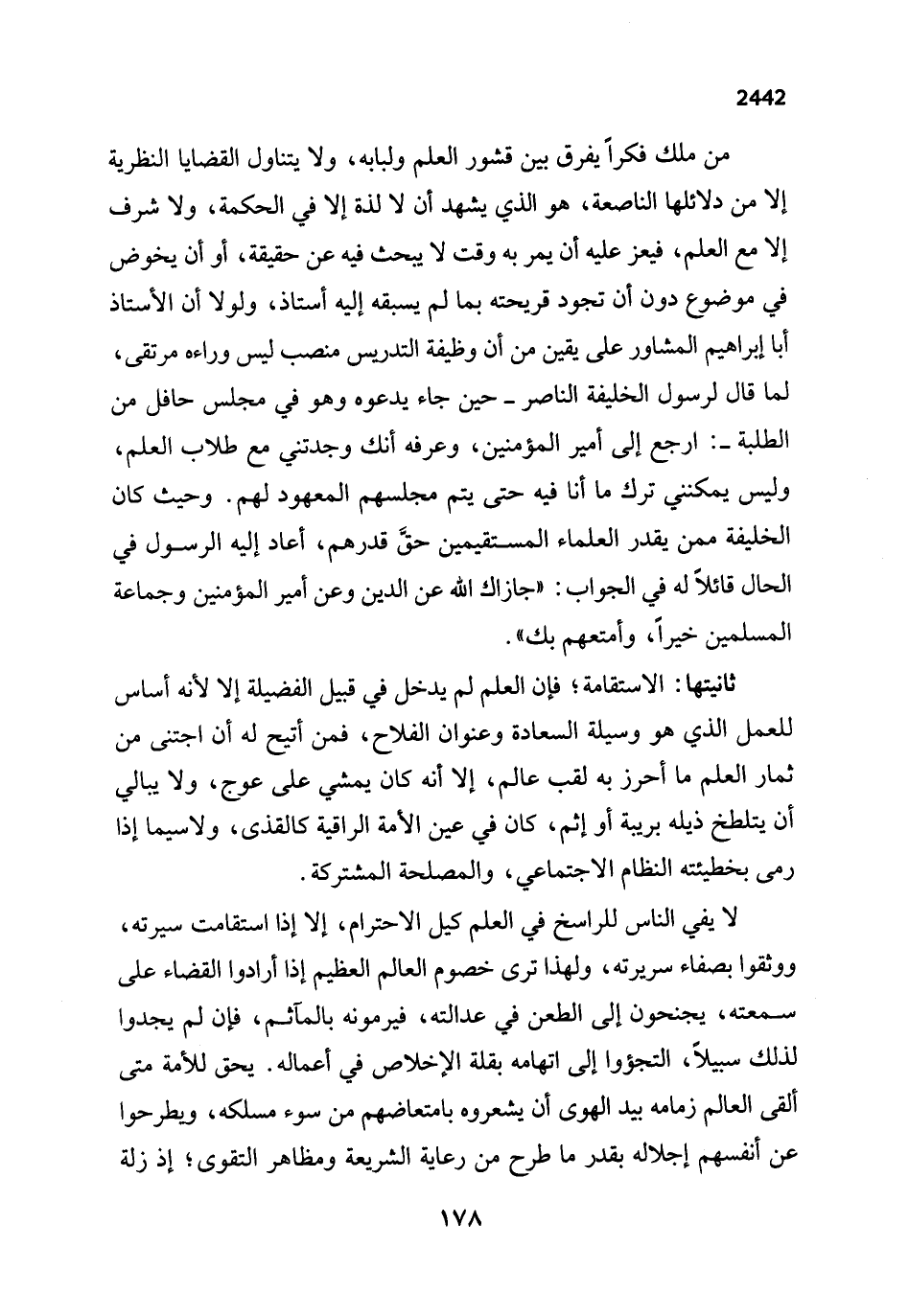 ثانيتها: الاستقامة؛ فإن العلم لم يدخل في قبيل الفضيلة إلا لأنه أساس للعمل الذي هو وسيلة السعادة وعنوان الفلاح، فمن أتيح له أن اجتنى من ثمار العلم ما أحرز به لقب عالم، إلا أنه كان يمشي على عوج، ولا يبالي أن يتلطخ ذيله بريبة أو إثم، كان في عين الأمة الراقية كالقذى، ولا سيما إذا رمى بخطيئته النظام الاجتماعي، والمصلحة المشتركة.