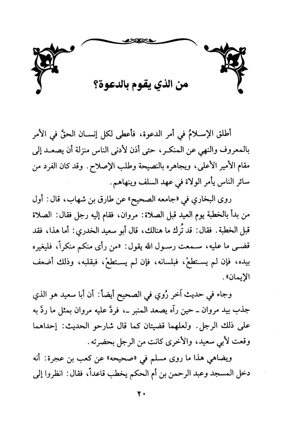 أطلق الإسلامُ في أمر الدعوة، فأعطى لكل إنسان الحقَّ في الأمر بالمعروف والنهي عن المنكر، حتى أذن لأدنى الناس منزلة أن يصعد إلى مقام الأمير الأعلى، ويجاهره بالنصيحة وطلب الإصلاح. وقد كان الفرد من سائر الناس يأمر الولاة في عهد السلف وينهاهم.