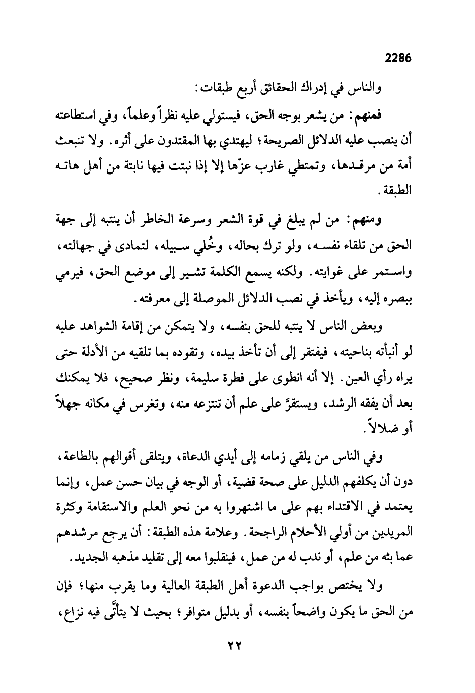 ولا يختص بواجب الدعوة أهل الطبقة العالية وما يقرب منها؛ فإن من الحق ما يكون واضحاً بنفسه، أو بدليل متوافر؛ بحيث لا يتأتَّى فيه نزاع،