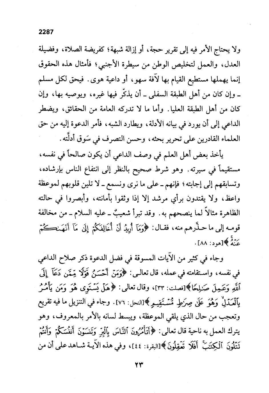 ولا يحتاج الأمر فيه إلى تقرير حجة، أو إزالة شبهة؛ كفريضة الصلاة، وفضيلة العدل، والعمل لتخليص الوطن من سيطرة الأجنبي؛ فأمثال هذه الحقوق إنما يهملها مستطيع القيام بها لآفة سهو، أو داعية هوى. فيحق لكل مسلم - وإن كان من أهل الطبقة السفلى- أن يذكّر فيها غيره، ويوصيه بها، وإن كان من أهل الطبقة العليا. وأما ما لا تدركه العامة من الحقائق، ويضطر الداعي إلى أن يورد في بيانه الأدلة، ويطارد الشبه، فأمر الدعوة إليه من حق العلماء القادرين على تحرير بحثه، وحسن التصرف في سَوق أدلَّته.