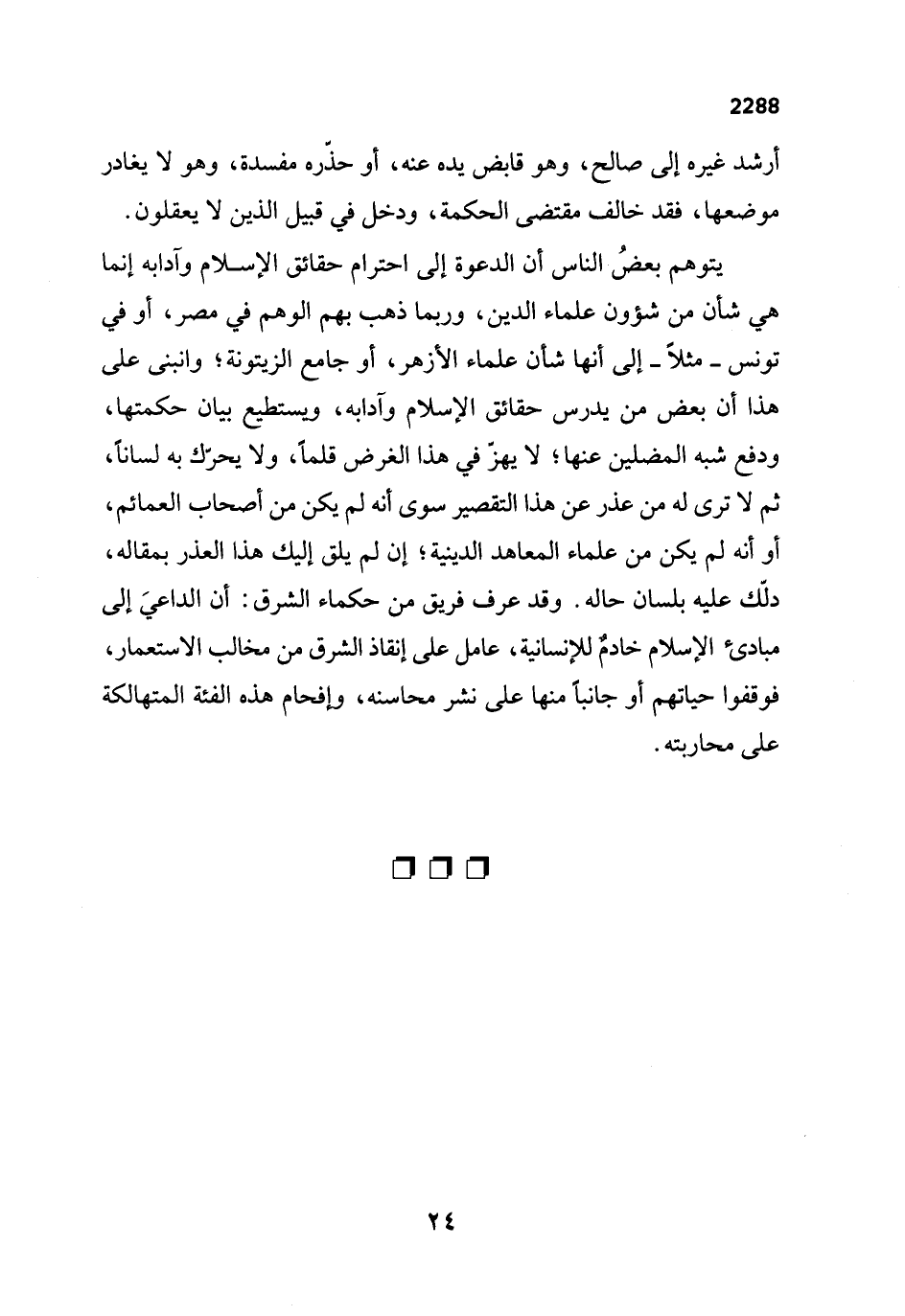 يتوهم بعضُ الناس أن الدعوة إلى احترام حقائق الإسلام وآدابه إنما هي شأن من شؤون علماء الدين، وربما ذهب بهم الوهم في مصر، أو في تونس- مثلاً - إلى أنها شأن علماء الأزهر، أو جامع الزيتونة؛ وانبنى على هذا أن بعض من يدرس حقائق الإسلام وآدابه، ويستطيع بيان حكمتها، ودفع شبه المضلين عنها؛ لا يهز في هذا الغرض قلمًا، ولا يحرّك به لسانًا، ثم لا ترى له من عذر عن هذا التقصير سوى أنه لم يكن من أصحاب العمائم، أو أنه لم يكن من علماء المعاهد الدينية؛ إن لم يلق إليك هذا العذر بمقاله، دلّك عليه بلسان حاله. وقد عرف فريق من حكماء الشرق: أن الداعيَ إلى مبادئ الإسلام خادمٌ للإنسانية، عامل على إنقاذ الشرق من مخالب الاستعمار، فوقفوا حياتهم أو جانباً منها على نشر محاسنه، وإفحام هذه الفئة المتهالكة على محاربته.