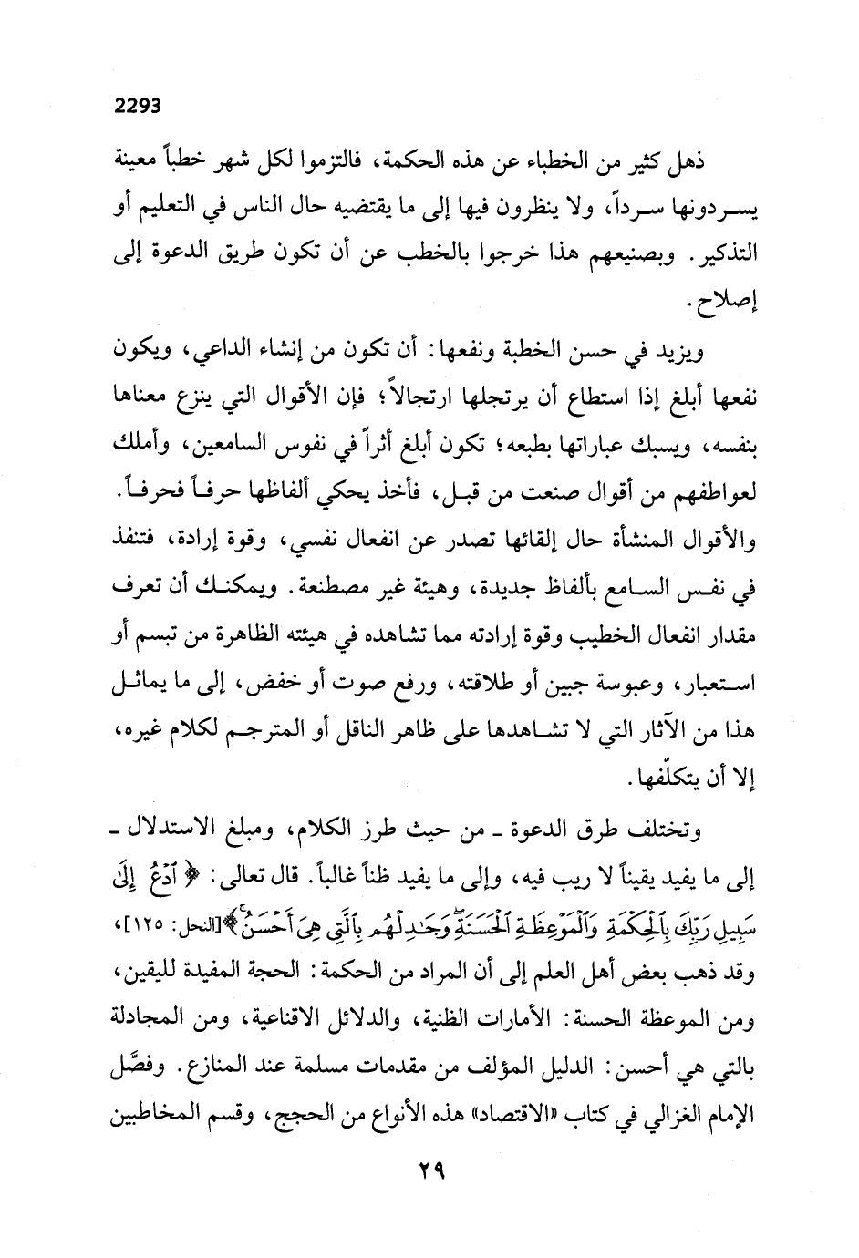 وتختلف طرق الدعوة - من حيث طرز الكلام، ومبلغ الاستدلال- إلى ما يفيد يقينًا لا ريب فيه، وإلى ما يفيد ظنًا غالباً. قال تعالى: {ادْعُ إِلَى سَبِيلِ رَبِّكَ بِالْحِكْمَةِ وَالْمَوْعِظَةِ الْحَسَنَةِ وَجَادِلْهُمْ بِالَّتِي هِيَ أَحْسَنُ} [النحل: 125]، وقد ذهب بعض أهل العلم إلى أن المراد من الحكمة: الحجة المفيدة لليقين، ومن الموعظة الحسنة: الأمارات الظنية، والدلائل الاقناعية، ومن المجادلة بالتي هي أحسن: الدليل المؤلف من مقدمات مسلمة عند المنازع. وفصَّل الإمام الغزالي في كتاب "الاقتصاد" هذه الأنواع من الحجج، وقسم المخاطبين