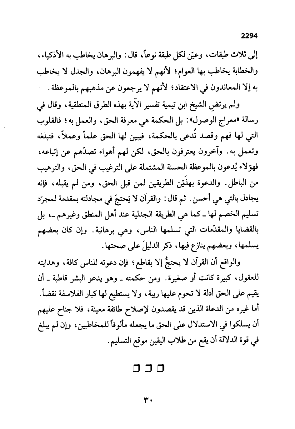 ولم يرتضِ الشيخ ابن تيمية تفسير الآية بهذه الطرق المنطقية، وقال في رسالة "معراج الوصول": بل الحكمة هي معرفة الحق، والعمل به؛ فالقلوب التي لها فهم وقصد تُدعى بالحكمة، فيبين لها الحق علماً وعملًا، فتبلغه وتعمل به. وآخرون يعترفون بالحق، لكن لهم أهواء تصدهم عن إتباعه، فهؤلاء يُدعون بالموعظة الحسنة المشتملة على الترغيب في الحق، والترهيب من الباطل. والدعوة بهذيْن الطريقين لمن قبل الحق، ومن لم يقبله، فإنه يجادل بالتي هي أحسن. ثم قال: والقرآن لا يَحتج في مجادلته بمقدمة لمجرّد تسليم الخصم لها - كما هي الطريقة الجدلية عند أهل المنطق وغيرهم -، بل بالقضايا والمقدّمات التي تسلمها الناس، وهي برهانية. وإن كان بعضهم يسلمها، وبعضهم ينازع فيها، ذكر الدليلَ على صحتها.