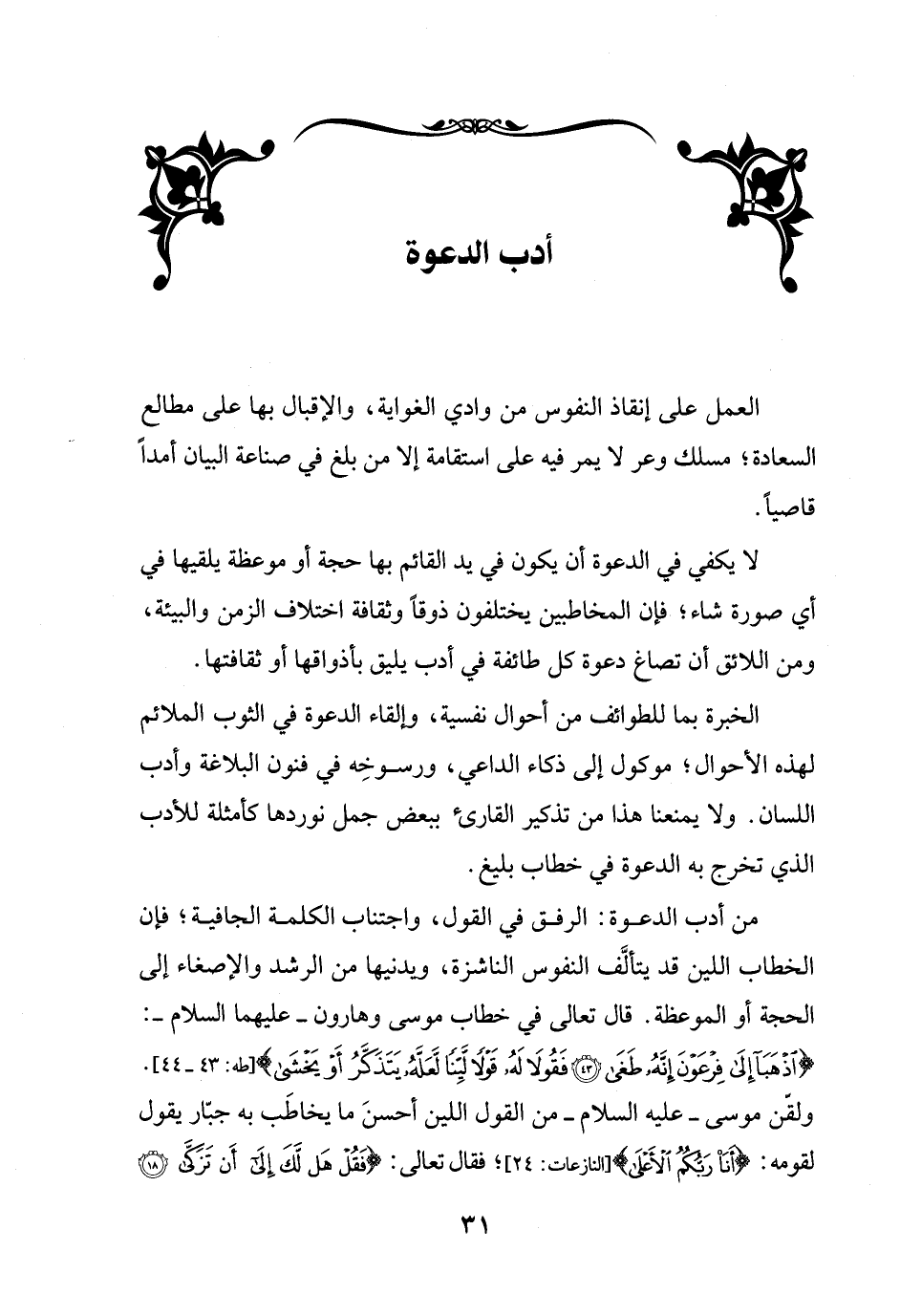 لا يكفي في الدعوة أن يكون يزيد القائم بها حجة أو موعظة يلقيها في أي صورة شاء؛ فإن المخاطبين يختلفون ذوقاً وثقافة اختلاف الزمن والبيئة، ومن اللائق أن تصاغ دعوة كل طائفة في أدب يليق بأذواقها أو ثقافتها.