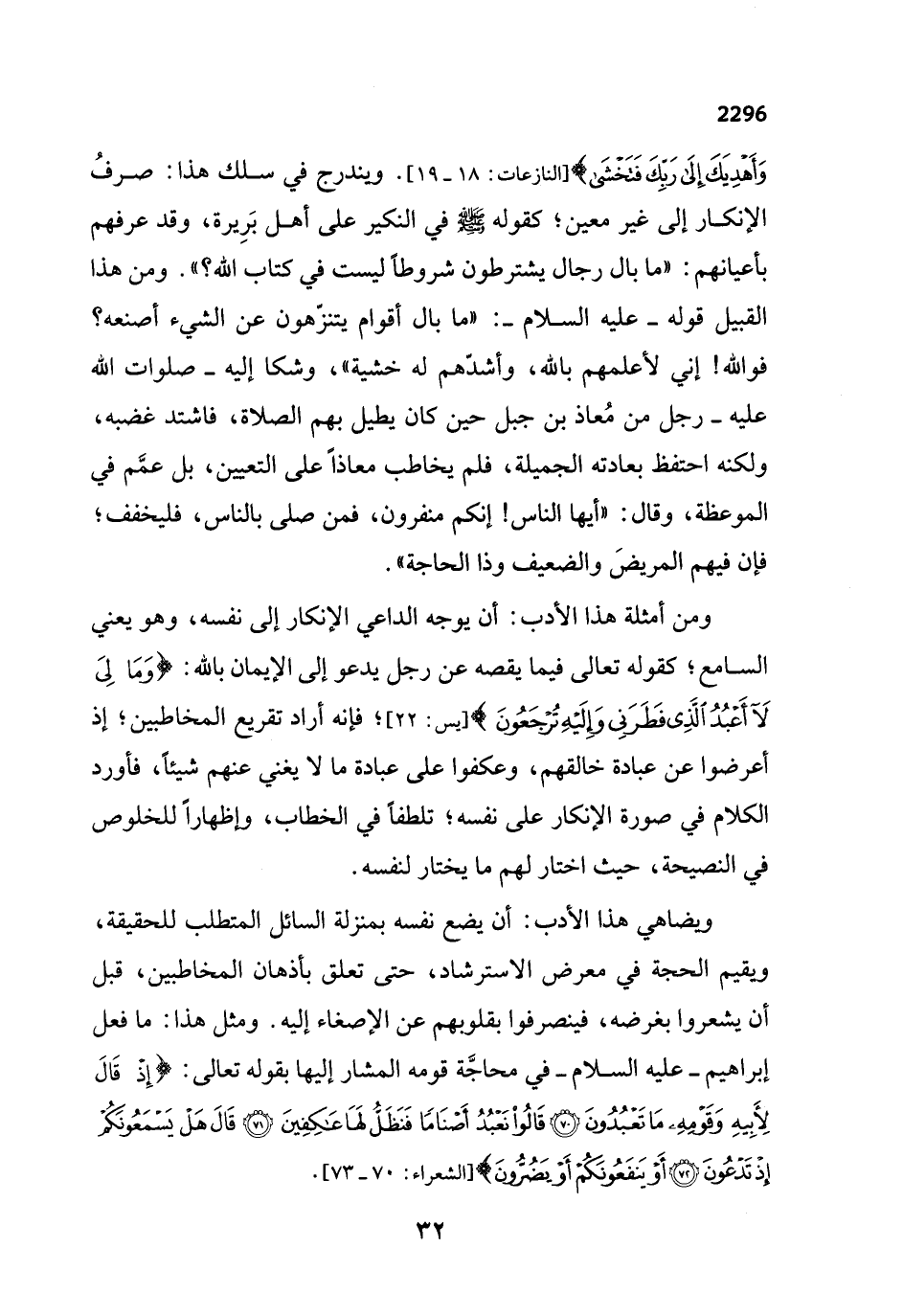 ومن أمثلة هذا الأدب: أن يوجه الداعي الإنكار إلى نفسه، وهو يعني السامع؛ كقوله تعالى فيما يقصه عن رجل يدعو إلى الإيمان بالله: {وَمَا لِيَ لَا أَعْبُدُ الَّذِي فَطَرَنِي وَإِلَيْهِ تُرْجَعُونَ} [يس: 22]، فإنه أراد تقريع المخاطبين؛ إذ أعرضوا عن عبادة خالقهم، وعكفوا على عبادة ما لا يغني عنهم شيئاً، فأورد الكلام في صورة الإنكار على نفسه؛ تلطفاً في الخطاب، وإظهاراً للخلوص في النصيحة، حيث اختار لهم ما يختار لنفسه.