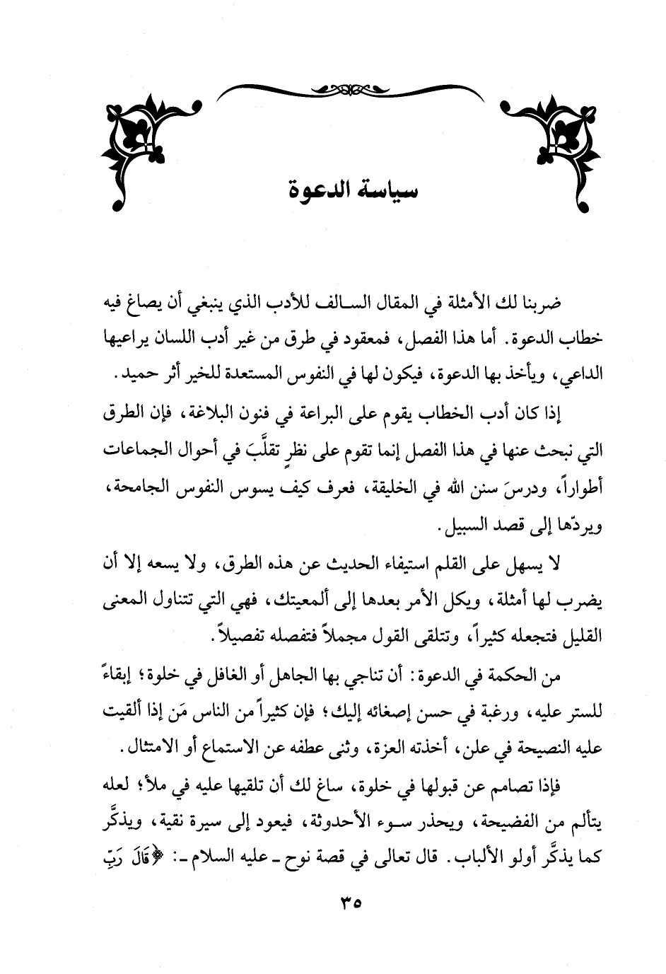ضربنا لك الأمثلة في المقال السالف للأدب الذي ينبغي أن يصاغ فيه خطاب الدعوة. أما هذا الفصل، فمعقود في طرق من غير أدب اللسان يراعيها الداعي، ويأخذ بها الدعوة، فيكون لها في النفوس المستعدة للخير أثر حميد.