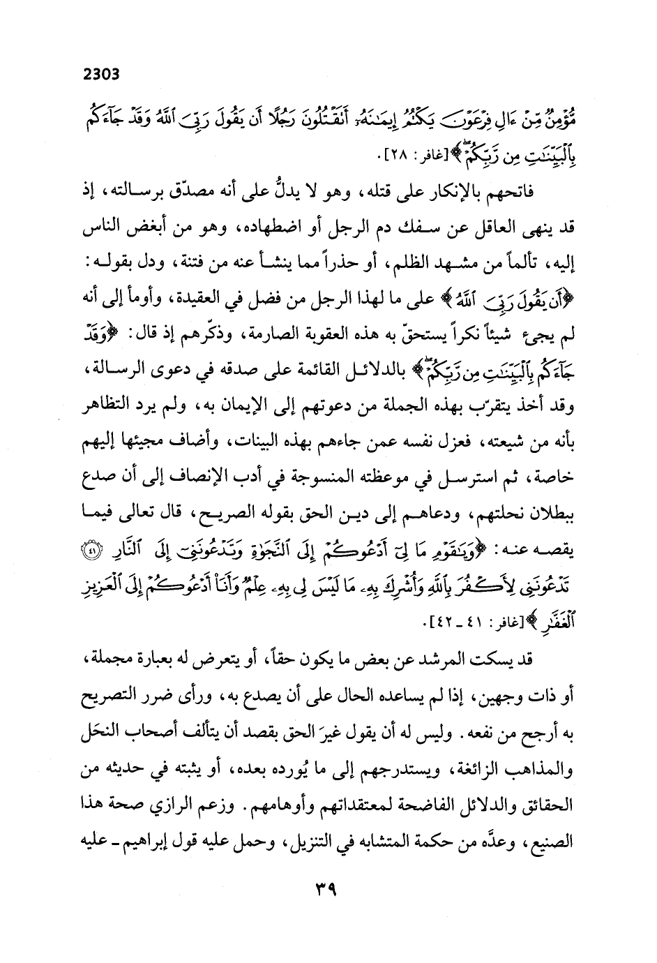 فاتحهم بالإنكار على قتله، وهو لا يدلُّ على أنه مصدّق برسالته، إذ قد ينهى العاقل عن سفك دم الرجل أو اضطهاده، وهو من أبغض الناس إليه، تألماً من مشهد الظلم، أو حذراً مما ينشأ عنه من فتنة، ودل بقوله: {أَنْ يَقُولَ رَبِّيَ اللَّهُ} [غافر: 28] على ما لهذا الرجل من فضل في العقيدة، وأومأ إلى أنه لم يجئ شيئاً نكراً يستحقّ به هذه العقوبة الصارمة، وذكّرهم إذ قال: {وَقَدْ جَاءَكُمْ بِالْبَيِّنَاتِ مِنْ رَبِّكُمْ} [غافر: 28] بالدلائل القائمة على صدقه في دعوى الرسالة، وقد أخذ يتقرّب بهذه الجملة من دعوتهم إلى الإيمان به، ولم يرد التظاهر بأنه من شيعته، فعزل نفسه عمن جاءهم بهذه البينات، وأضاف مجيئها إليهم خاصة، ثم استرسل في موعظته المنسوجة في أدب الإنصاف إلى أن صدع ببطلان نحلتهم، ودعاهم إلى دين الحق بقوله الصريح، قال تعالى فيما يقصه عنه: {وَيَاقَوْمِ مَا لِي أَدْعُوكُمْ إِلَى النَّجَاةِ وَتَدْعُونَنِي إِلَى النَّارِ (41) تَدْعُونَنِي لِأَكْفُرَ بِاللَّهِ وَأُشْرِكَ بِهِ مَا لَيْسَ لِي بِهِ عِلْمٌ وَأَنَا أَدْعُوكُمْ إِلَى الْعَزِيزِ الْغَفَّارِ} [غافر: 41، 42].
