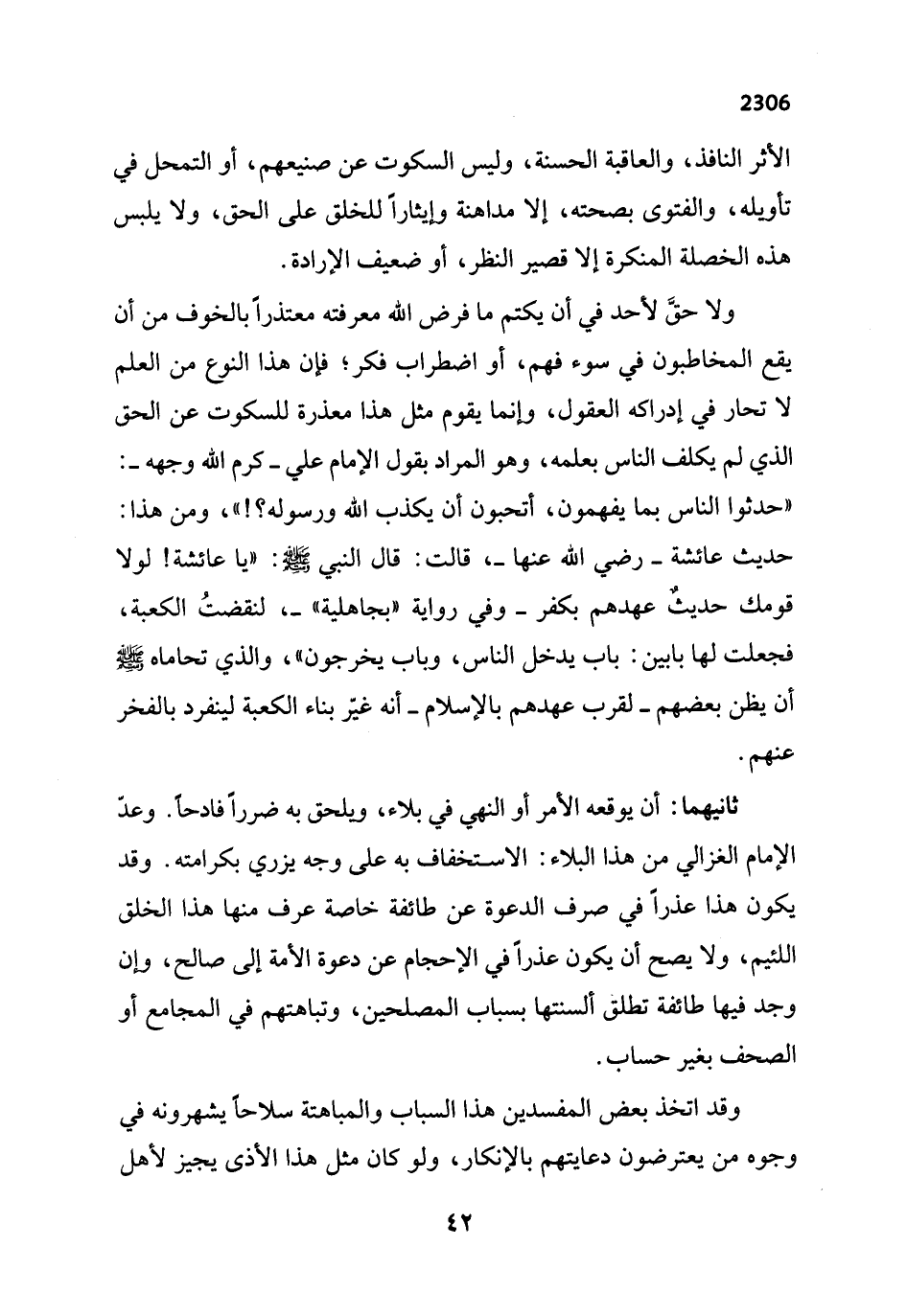 الأثر النافذ، والعاقبة الحسنة، وليس السكوت عن صنيعهم، أو التمحل في تأويله، والفتوى بصحته، إلا مداهنة وإيثاراً للخلق على الحق، ولا يلبس هذه الخصلة المنكرة إلا قصير النظر، أو ضعيف الإرادة.