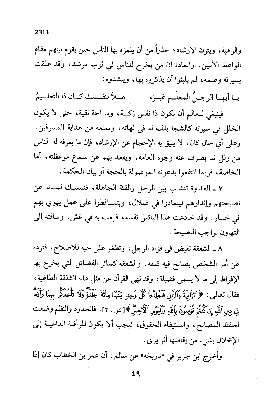 فينبغي للعالم أن يكون ذا نفس زكية، وساحة نقية، حتى لا يكون الخلل في سيرته كالشجا يقف له في لهاته، ويمنعه من هداية المسرفين. وعلى أي حال كان، لا يليق به الإحجام عن الإرشاد، فإن ما يعرفه له الناس من زلل قد يصرف عنه وجوه العامة، ويقعد بهم عن سماع موعظته، أما الخاصة، فربما انتفعوا بدعوته الموصولة بالحجة أو بيان الحكمة.