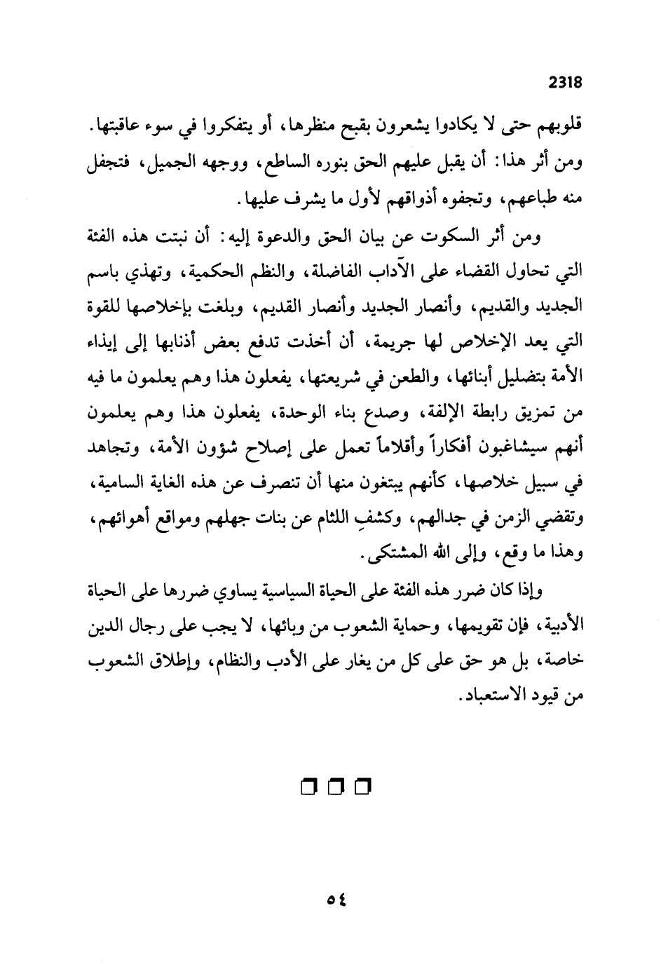ومن أثر السكوت عن بيان الحق والدعوة إليه: أن نبتت هذه الفئة التي تحاول القضاء على الآداب الفاضلة، والنظم الحكمية، وتهذي باسم الجديد والقديم، وأنصار الجديد وأنصار القديم، ويلغت بإخلاصها للقوة التي يعد الإخلاص لها جريمة، أن أخذت تدفع بعض أذنابها إلى إيذاء الأمة بتضليل أبنائها، والطعن في شريعتها، يفعلون هذا وهم يعلمون ما فيه من تمزيق رابطة الإلفة، وصدع بناء الوحدة، يفعلون هذا وهم يعلمون أنهم سيشاغبون أفكاراً وأقلاماً تعمل على إصلاح شؤون الأمة، وتجاهد في سبيل خلاصها، كانهم يبتغون منها أن تنصرف عن هذه الغاية السامية، وتقضي الزمن في جدالهم، وكشفِ اللثام عن بنات جهلهم ومواقع أهوائهم، وهذا ما وقع، وإلى الله المشتكى.