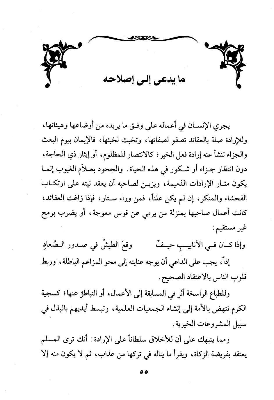 يجري الإنسان في أعماله على وفق ما يريده من أوضاعها وهيئاتها، وللإرادة صلة بالعقائد تصفو لصفائها، وتخبث لخبثها، فالإيمان بيوم البعث والجزاء تنشأ عنه إرادة فعل الخير؛ كالانتصار للمظلوم، أو إيثار ذي الحاجة، دون انتظار جزاء أو شكور في هذه الحياة. والجحود بعلاّم الغيوب إنما يكون مثار الإرادات الذميمة، ويزين لصاحبه أن يعقد نيته على ارتكاب الفحشاء والمنكر، إن لم يكن علناً، فمن وراء ستار، فإذا زاغت العقائد، كانت أعمال صاحبها بمنزلة من يرمي عن قوس معوجة، أو يضرب برمح غير مستقيم: