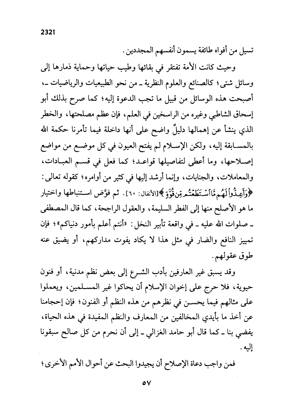 وحيث كانت الأمة تفتقر في بقائها وطيب حياتها وحماية ذمارها إلى وسائل شتى؛ كالصناع والعلوم النظرية- من نحو الطبيعيات والرياضيات -، أصبحت هذه الوسائل من قبيل ما تجب الدعوة إليه، كما صرح بذلك أبو إسحاق الشاطيي وغيره من الراسخين في العلم، فإن عظم مصلحتها، والخطر الذي ينشأ عن إهمالها دليلٌ واضح على أنها داخلة فيما تأمرنا حكمة الله بالمسابقة إليه، ولكن الإسلام لم يفتح العيون في كل موضع من مواضع إصلاحها، وما أعطى لتفاصيلها قواعد؛ كما فعل في قسم العبادات، والمعاملات، والجنايات، وإنما أرشد إليها في كثير من أوامره؛ كقوله تعالى: {وَأَعِدُّوا لَهُمْ مَا اسْتَطَعْتُمْ مِنْ قُوَّةٍ} [الأنفال: 65]. ثم فوَّض استنباطها واختيار ما هو الأصلح منها إلى الفطر السليمة، والعقول الراجحة، كما قال المصطفى - صلوات الله عليه - في واقعة تأبير النخل: "أنتم أعلم بأمور دنياكم"؛ فإن تمييز النافع والضار في مثل هذا لا يكاد يفوت مداركهم، أو يضيق عنه طوق عقولهم.