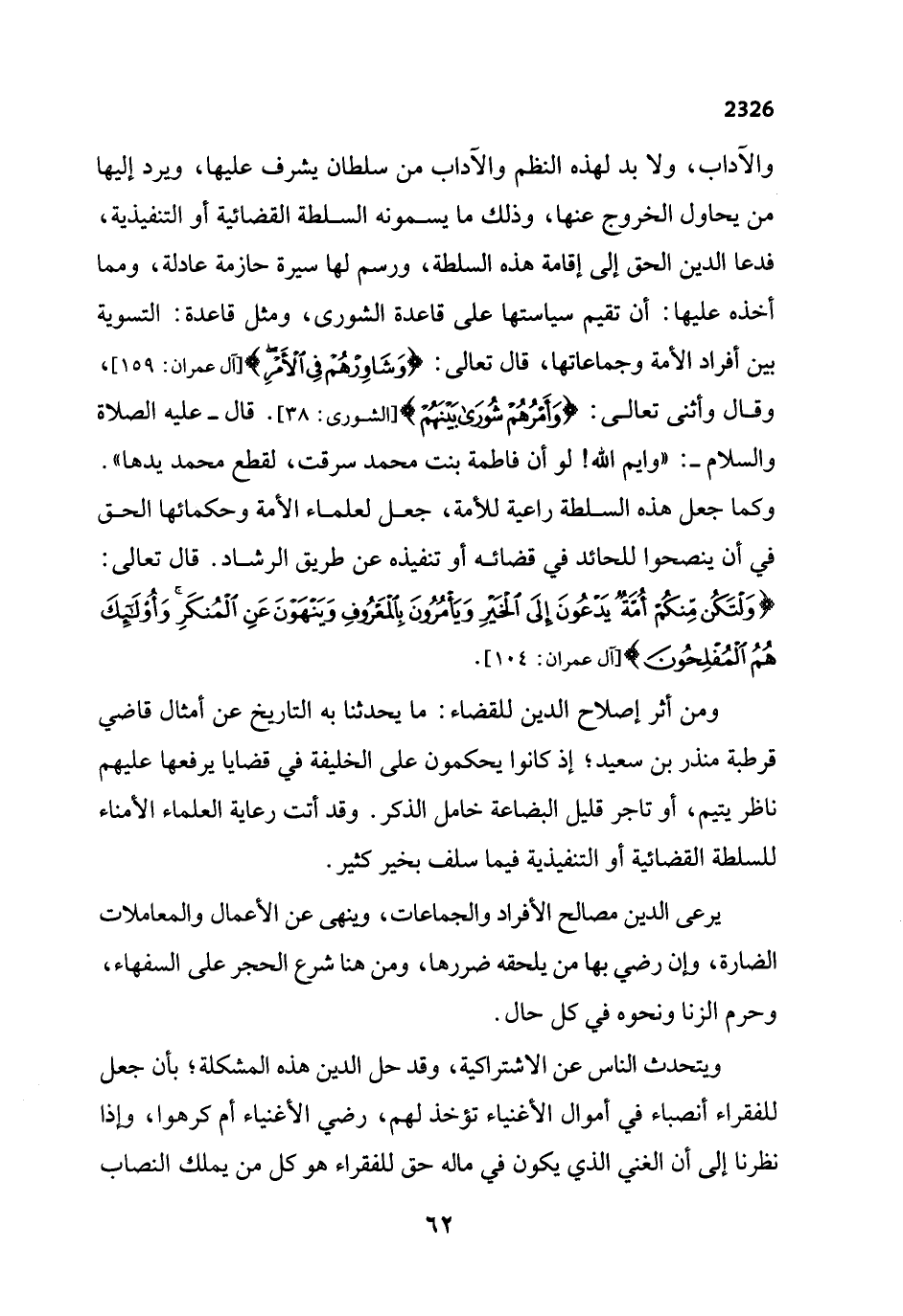 والآداب، ولا بد لهذه النظم والآداب من سلطان يشرف عليها، ويرد إليها من يحاول الخروج عنها، وذلك ما يسمونه السلطة القضائية أو التنفيذية، فدعا الدين الحق إلى إقامة هذه السلطة، ورسم لها سيرة حازمة عادلة، ومما أخذه عليها: أن تقيم سياستها على قاعدة الشورى، ومثل قاعدة: التسوية بين أفراد الأمة وجماعاتها، قال تعالى: {وَشَاوِرْهُمْ فِي الْأَمْرِ} [آل عمران: 159]، وقال وأثنى تعالى: {وَأَمْرُهُمْ شُورَى بَيْنَهُمْ} [الشورى: 38]. قال- عليه الصلاة والسلام -: "وايم الله! لو أن فاطمة بنت محمد سرقت، لقطع محمد يدها". وكما جعل هذه السلطة راعية للأمة، جعل لعلماء الأمة وحكمائها الحق في أن ينصحوا للحائد في قضائه اْو تنفيذه عن طريق الرشاد. قال تعالى: {وَلْتَكُنْ مِنْكُمْ أُمَّةٌ يَدْعُونَ إِلَى الْخَيْرِ وَيَأْمُرُونَ بِالْمَعْرُوفِ وَيَنْهَوْنَ عَنِ الْمُنْكَرِ وَأُولَئِكَ هُمُ الْمُفْلِحُونَ} [آل عمران: 104].
