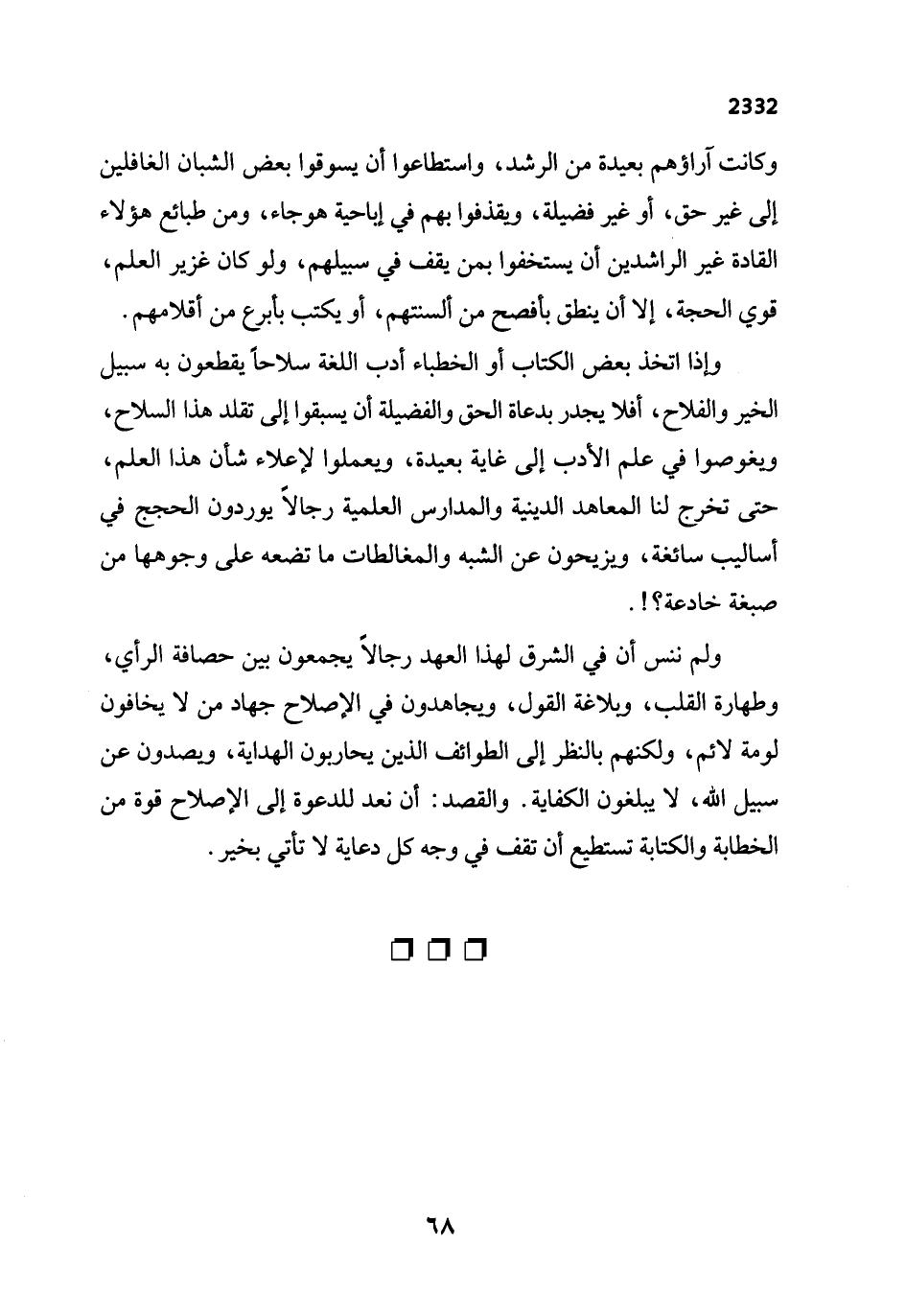 وإذا اتخذ بعض الكتاب أو الخطباء أدب اللغة سلاحاً يقطعون به سبيل الخير والفلاح، أفلا يجدر بدعاة الحق والفضيلة أن يسبقوا إلى تقلد هذا السلاح، ويغوصوا في علم الأدب إلى غاية بعيدة، ويعملوا لإعلاء شأن هذا العلم، حتى تخرج لنا المعاهد الدينية والمدارس العلمية رجالاً يوردون الحجج في أساليب سائغة، ويزيحون عن الشبه والمغالطات ما تضعه على وجوهها من صبغة خادعة؟!.