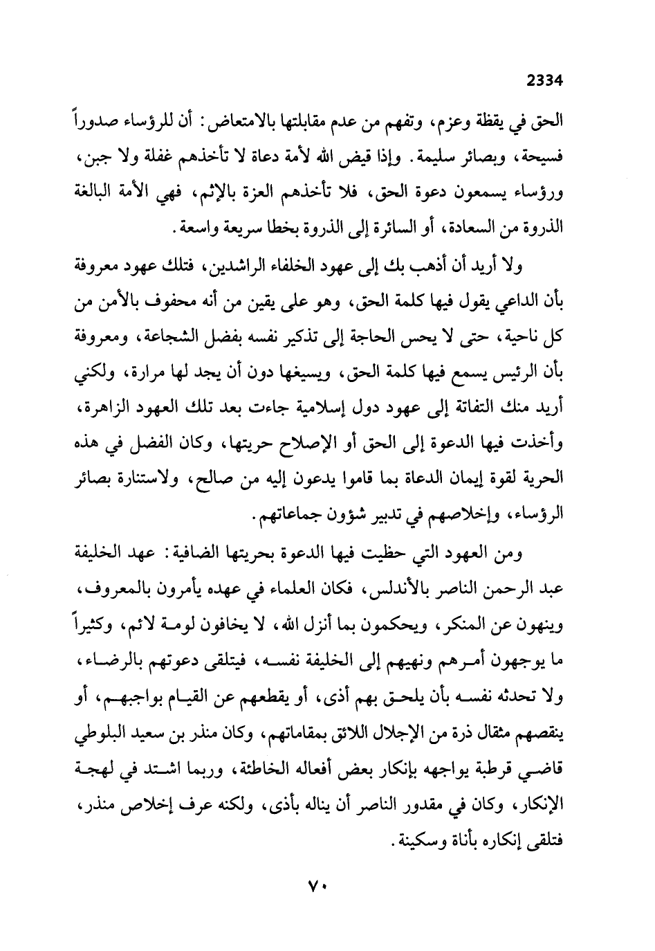 ولا أريد أن أذهب بك إلى عهود الخلفاء الراشدين، فتلك عهود معروفة بان الداعي يقول فيها كلمة الحق، وهو على يقين من أنه محفوف بالأمن من كل ناحية، حتى لا يحس الحاجة إلى تذكير نفسه بفضل الشجاعة، ومعروفة بأن الرئيس يسمع فيها كلمة الحق، ويسيغها دون أن يجد لها مرارة، ولكني أريد منك التفاتة إلى عهود دول إسلامية جاءت بعد تلك العهود الزاهرة، وأخذت فيها الدعوة إلى الحق أو الإصلاح حريتها، وكان الفضل في هذه الحرية لقوة إيمان الدعاة بما قاموا يدعون إليه من صالح، ولاستنارة بصائر الرؤساء، وإخلاصهم في تدبير شؤون جماعاتهم.