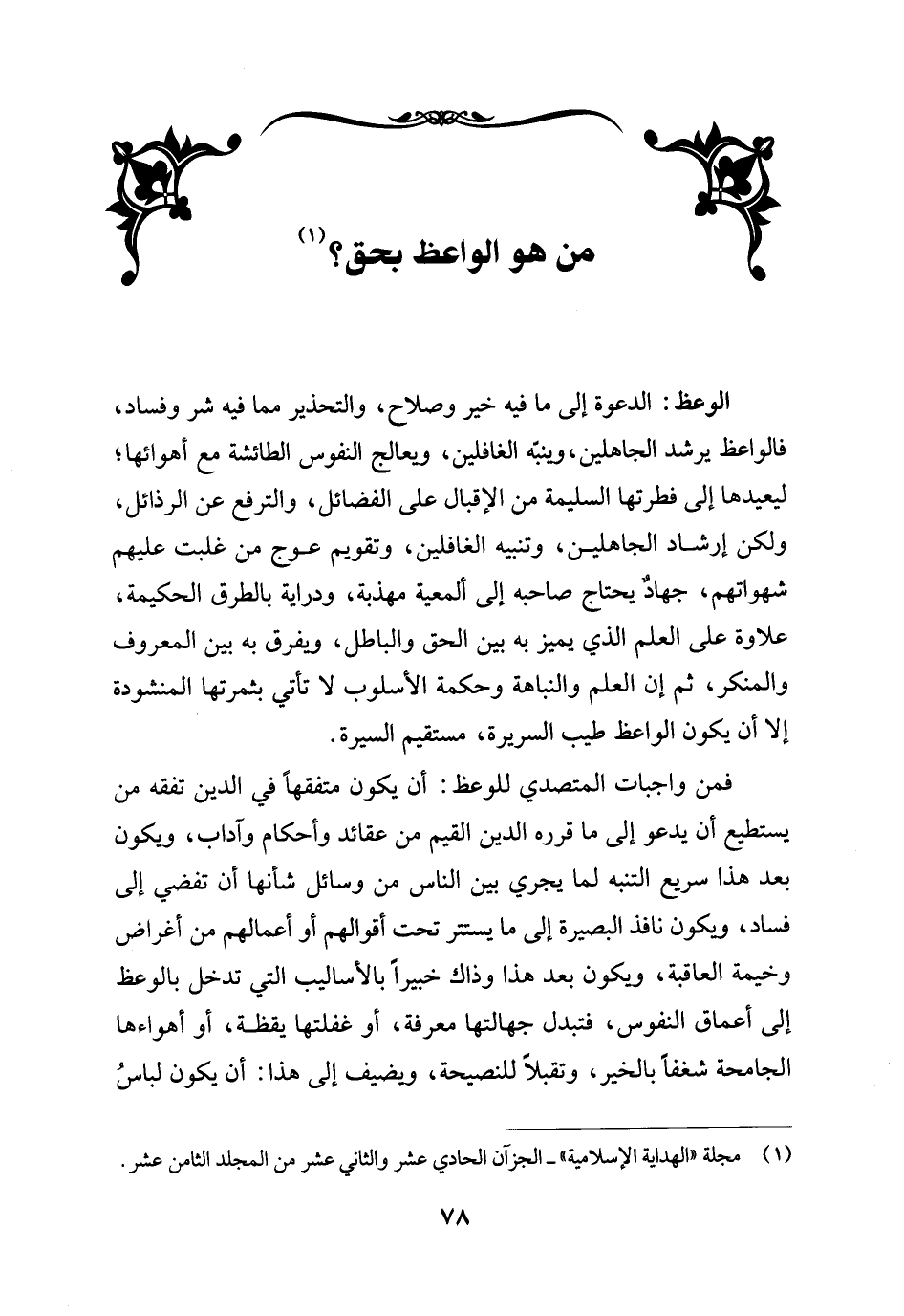 الوعظ: الدعوة إلى ما فيه خير وصلاح، والتحذير مما فيه شر وفساد، فالواعظ يرشد الجاهلين، وينبه الغافلين، ويعالج النفوس الطائشة مع أهوائها؛ ليعيدها إلى فطرتها السليمة من الإقبال على الفضائل، والترفع عن الرذائل، ولكن إرشاد الجاهلين، وتنبيه الغافلين، وتقويم عوج من غلبت عليهم شهواتهم، جهادٌ يحتاج صاحبه إلى ألمعية مهذبة، ودراية بالطرق الحكيمة، علاوة على العلم الذي يميز به بين الحق والباطل، ويفرق به بين المعروف والمنكر، ثم إن العلم والنباهة وحكمة الأسلوب لا تاتي بثمرتها المنشودة إلا أن يكون الواعظ طيب السريرة، مستقيم السيرة.