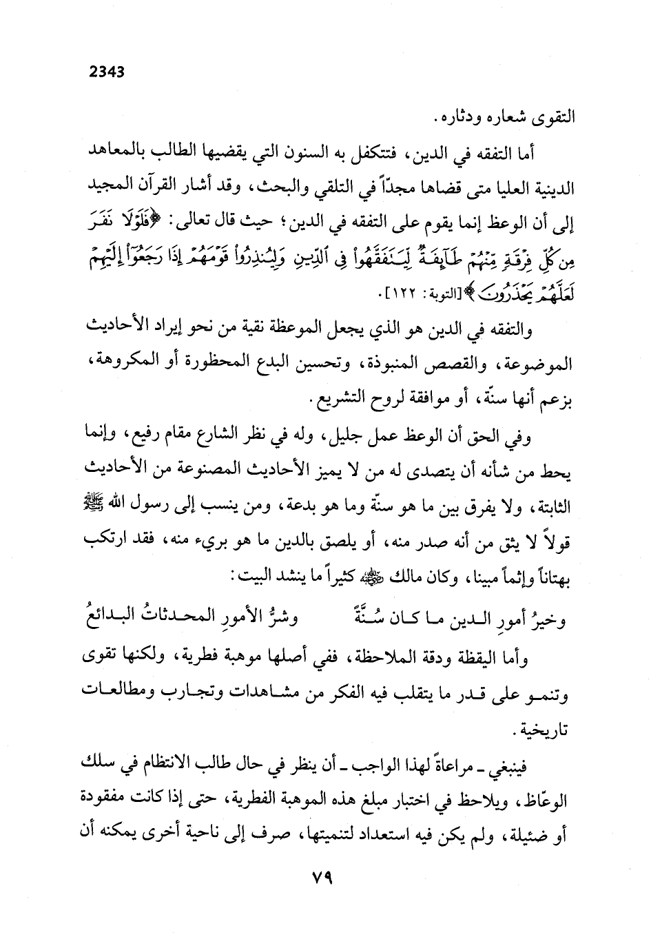 والتفقه في الدين هو الذي يجعل الموعظة نقية من نحو إيراد الأحاديث الموضوعة، والقصص المنبوذة، وتحسين البدع المحظورة أو المكروهة، بزعم أنها سنّة، أو موافقة لروح التشريع.