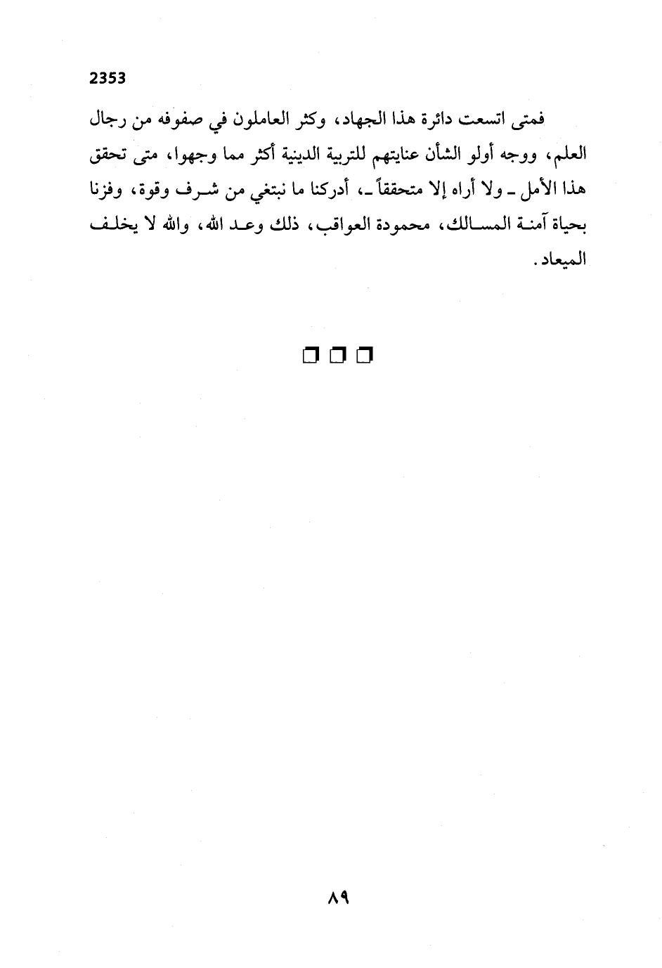 فمتى اتسعت دائرة هذا الجهاد، وكثر العاملون في صفوفه من رجال العلم، ووجه أولو الشأن عنايتهم للتربية الدينية أكثر مما وجهوا، متى تحقق هذا الأمل - ولا أراه إلا متحققاً -، أدركنا ما نبتغي من شرف وقوة، وفزنا بحياة آمنة المسالك، محمودة العواقب، ذلك وعد الله، والله لا يخلف الميعاد.