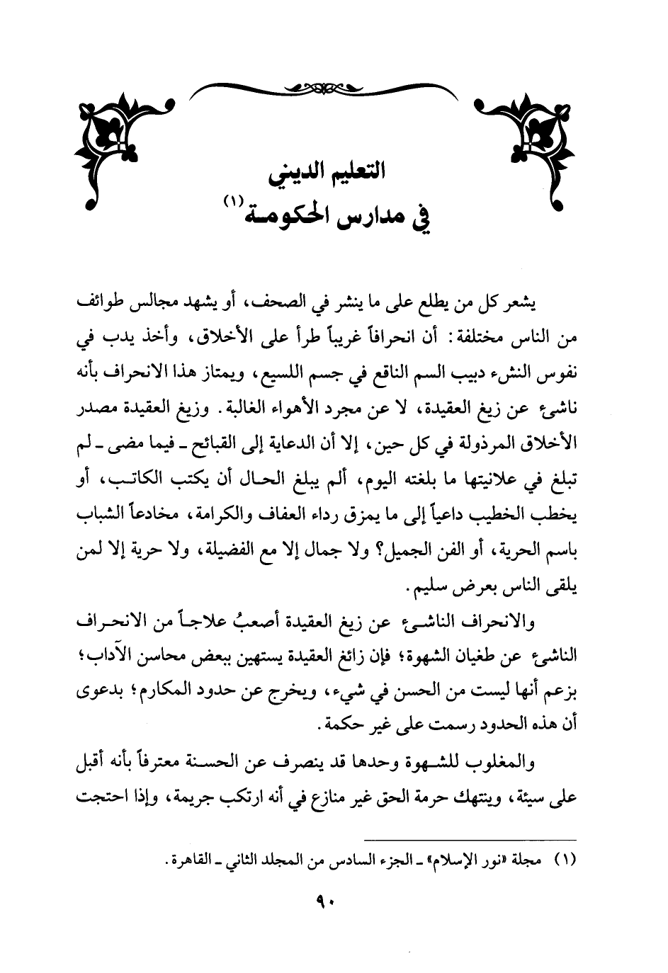 يشعر كل من يطلع على ما ينشر في الصحف، أو يشهد مجالس طوائف من الناس مختلفة: أن انحرافاً غريباً طرأ على الأخلاق، وأخذ يدب في نفوس النشء دبيب السم الناقع في جسم اللسيع، ويمتاز هذا الانحراف بأنه ناشئ عن زيغ العقيدة، لا عن مجرد الأهواء الغالبة. وزيغ العقيدة مصدر الأخلاق المرذولة في كل حين، إلا أن الدعاية إلى القبائح - فيما مضى - لم تبلغ في علانيتها ما بلغته اليوم، ألم يبلغ الحال أن يكتب الكاتب، أو يخطب الخطيب داعياً إلى ما يمزق رداء العفاف والكرامة، مخادعاً الشباب باسم الحرية، أو الفن الجميل؟ ولا جمال إلا مع الفضيلة، ولا حرية إلا لمن يلقى الناس بعرض سليم.