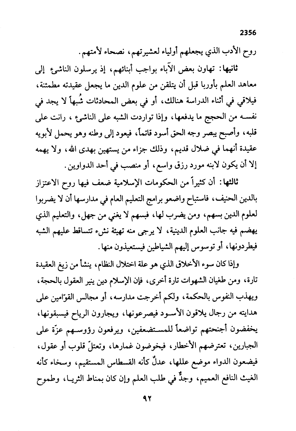 ثانيها: تهاون بعض الآباء بواجب أبنائهم، إذ يرسلون الناشئ إلى معاهد العلم باوربا قبل أن يتلقن من علوم الدين ما يجعل عقيدته مطمئنة، فيلاقي في أثناء الدراسة هنالك، أو في بعض المحادثات شُبهاً لا يجد في نفسه من الحجج ما يدفعها، وإذا تواردت الشبه على الناشئ، رانت على قلبه، وأصبح يبصر وجه الحق أسود قاتما، فيعود إلى وطنه وهو يحمل لأبويه عقيدة أنهما في ضلال قديم، وذلك جزاء من يستهين بهدى الله، ولا يهمه إلا أن يكون لابنه مورد رزق واسع، أو منصب في أحد الدواوين.