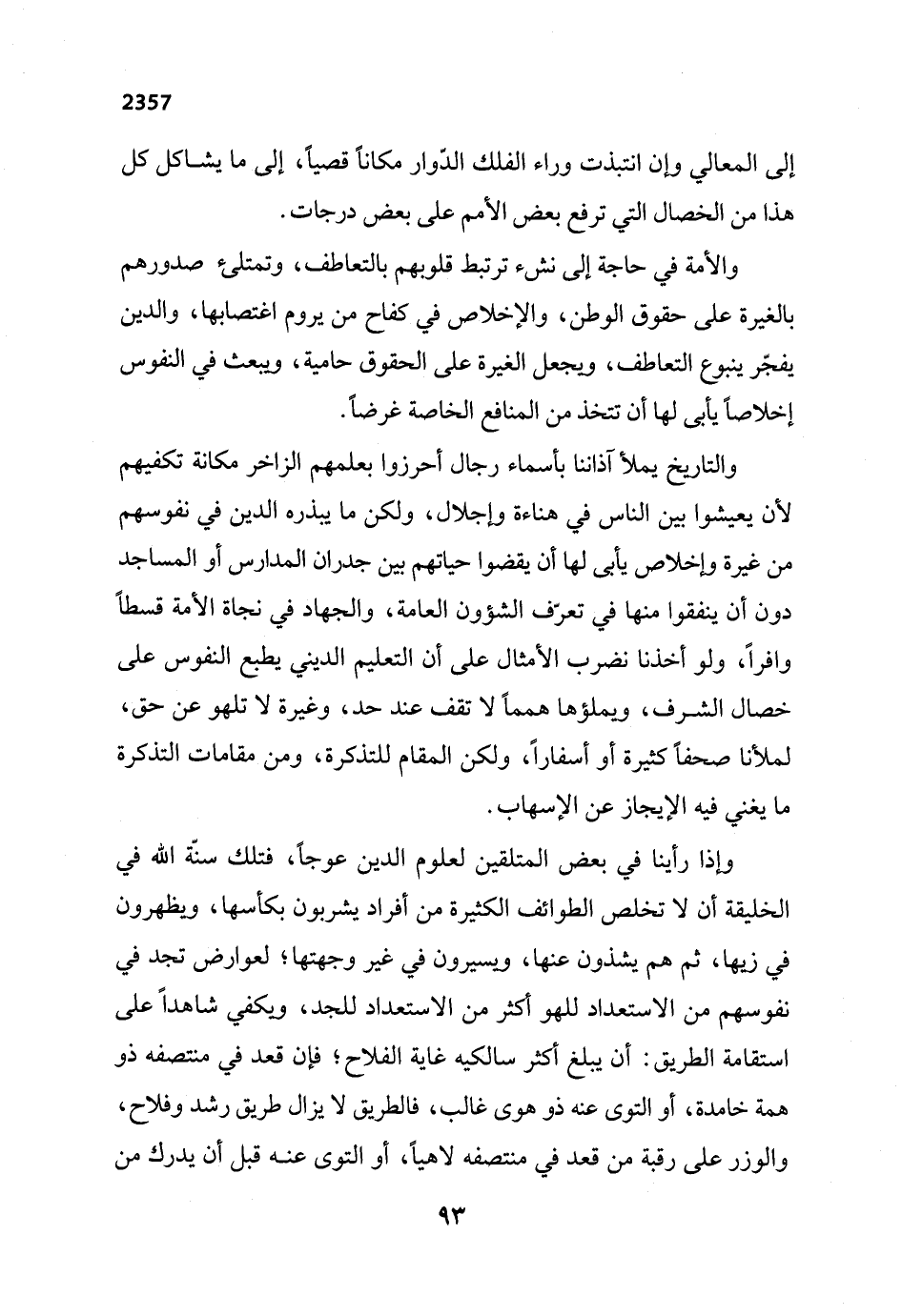 وإذا رأينا في بعض المتلقين لعلوم الدين عوجاً، فتلك سنّة الله في الخليقة أن لا تخلص الطوائف الكثيرة من أفراد يشربون بكأسها، ويظهرون في زيها، ثم هم يشذون عنها، ويسيرون في غير وجهتها؛ لعوارض تجد في نفوسهم من الاستعداد للهو أكثر من الاستعداد للجد، ويكفي شاهداً على استقامة الطريق: أن يبلغ أكثر سالكيه غاية الفلاح، فإن قعد في منتصفه ذو همة خامدة، أو التوى عنه ذو هوى غالب، فالطريق لا يزال طريق رشد وفلاح، والوزر على رقبة من قعد في منتصفه لاهياً، أو التوى عنه قبل أن يدرك من