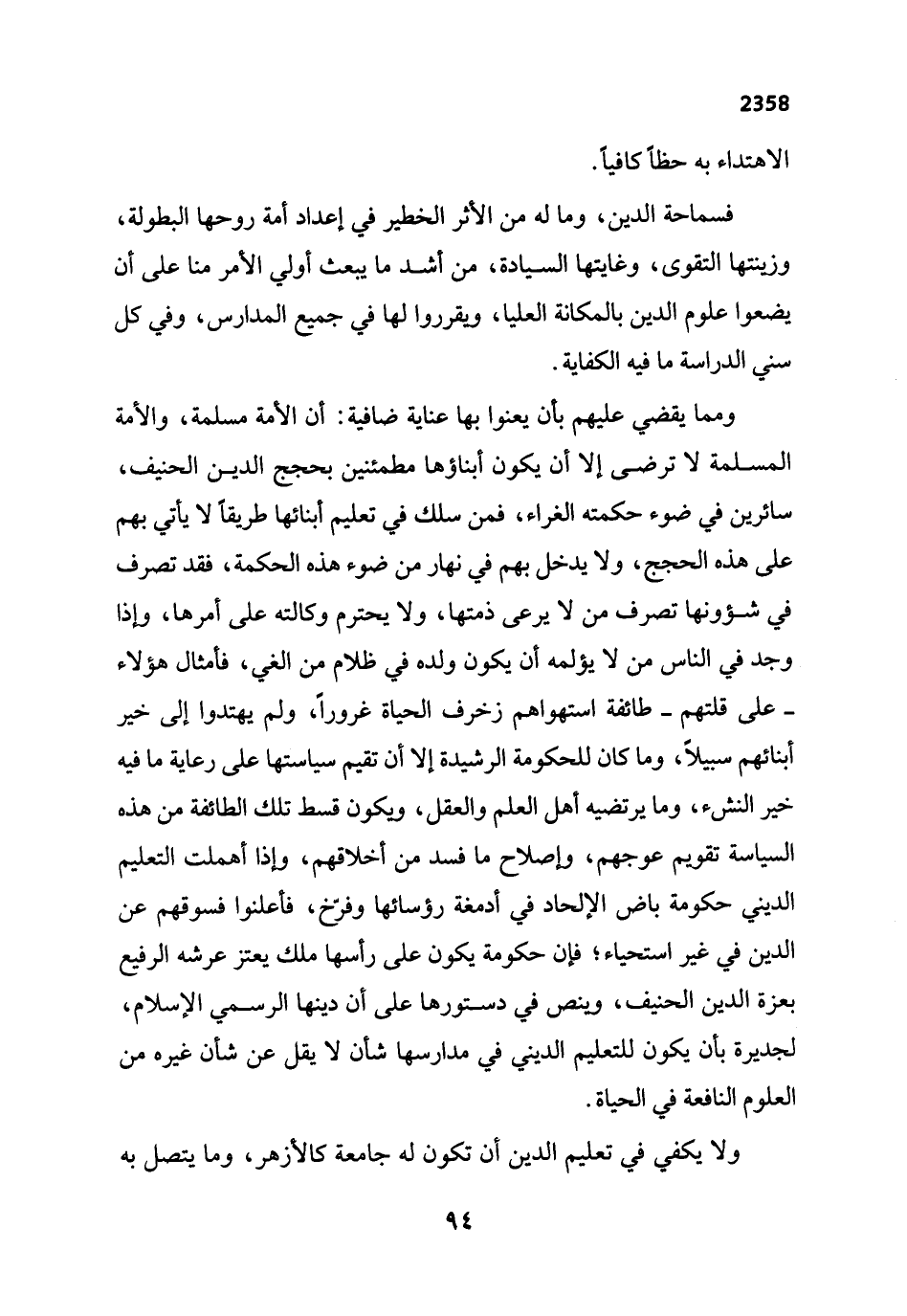 فسماحة الدين، وما له من الأثر الخطير في إعداد أمة روحها البطولة، وزينتها التقوى، وغايتها السيادة، من أشد ما يبعث أولي الأمر منا على أن يضعوا علوم الدين بالمكانة العليا، ويقرروا لها في جميع المدارس، وفي كل سني الدراسة ما فيه الكفاية.