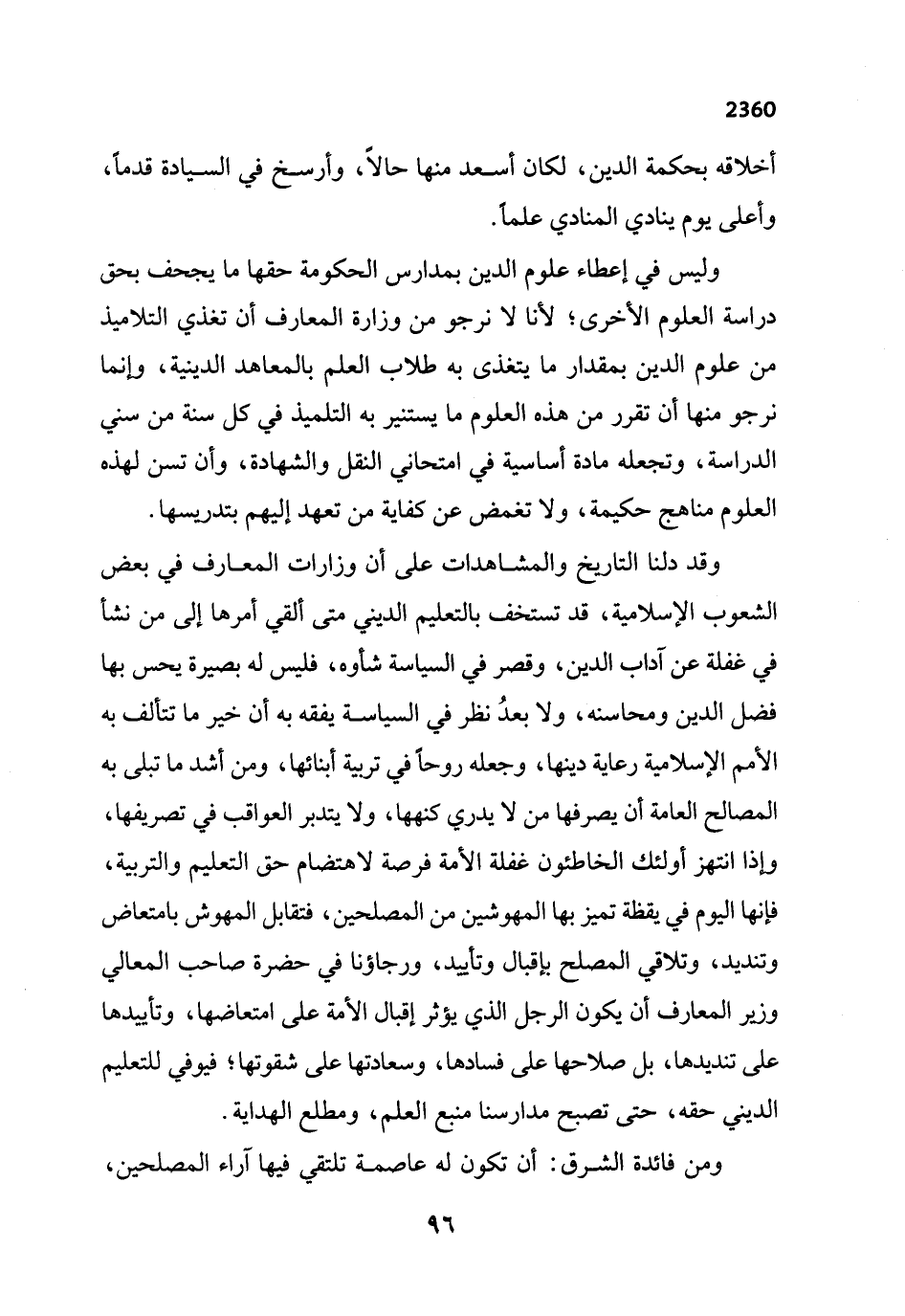 وقد دلنا التاريخ والمشاهدات على أن وزارات المعارف في بعض الشعوب الإسلامية، قد تستخف بالتعليم الديني متى ألقي أمرها إلى من نشأ في غفلة عن آداب الدين، وقصر في السياسة شأوه، فليس له بصيرة يحس بها فضل الدين ومحاسنه، ولا بعدُ نظر في السياسة يفقه به أن خير ما تتألف به الأمم الإسلامية رعاية دينها، وجعله روحاً في تربية أبنائها، ومن أشد ما تبلى به المصالح العامة أن يصرفها من لا يدري كنهها، ولا يتدبر العواقب في تصريفها، وإذا انتهز أولئك الخاطئون غفلة الأمة فرصة لاهتضام حق التعليم والتربية، فإنها اليوم في يقظة تميز بها المهوشين من المصلحين، فتقابل المهوش بامتعاض وتنديد، وتلاقي المصلح بإقبال وتأييد، ورجاؤنا في حضرة صاحب المعالي وزير المعارف أن يكون الرجل الذي يؤثر إقبال الأمة على امتعاضها، وتأييدها على تنديدها، بل صلاحها على فسادها، وسعادتها على شقوتها؛ فيوفي للتعليم الديني حقه، حتى تصبح مدارسنا منبع العلم، ومطلع الهداية.