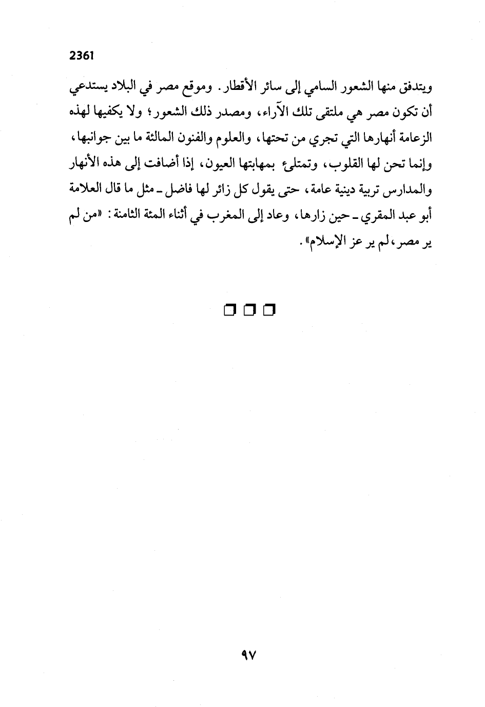 ويتدفق منها الشعور السامي إلى سائر الأقطار. وموقع مصر في البلاد يستدعي أن تكون مصر هي ملتقى تلك الآراء، ومصدر ذلك الشعور؛ ولا يكفيها لهذه الزعامة أنهارها التي تجري من تحتها، والعلوم والفنون المالئة ما بين جوانبها، وإنما تحن لها القلوب، وتمتلئ بمهابتها العيون، إذا أضافت إلى هذه الأنهار والمدارس تربية دينية عامة، حتى يقول كل زائر لها فاضل - مثل ما قال العلامة أبو عبد المقري - حين زارها، وعاد إلى المغرب في أثناء المئة الثامنة: "من لم ير مصر، لم ير عز الإسلام".