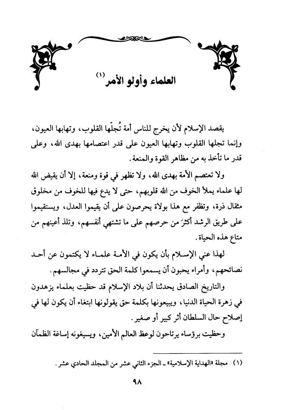 ولا تعتصم الأمة بهدى الله، ولا تظهر في قوة ومنعة، إلا أن يقيض الله لها علماء يملأ الخوف من الله قلوبهم، حتى لا يدع فيها للخوف من مخلوق مثقال ذرة، وتظفر مع هذا بولاة يحرصون على أن يقيموا العدل، ويستقيموا على طريق الرشد كثرَ من حرصهم على ما تشتهي أنفسهم، وتلذ أعينهم من متاع هذه الحياة.