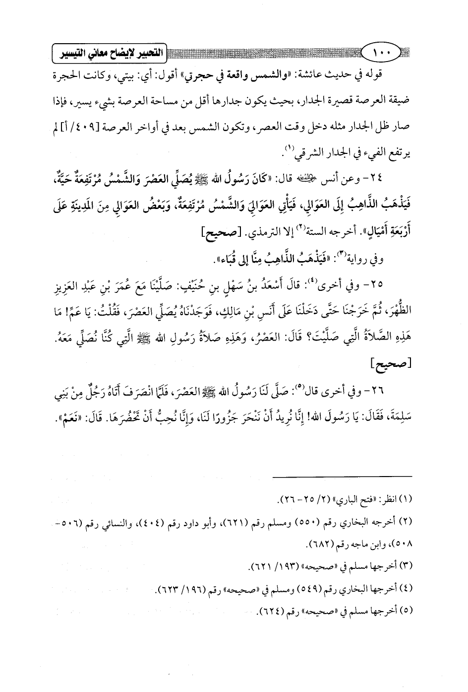 24 - وعن أنس - رضي الله عنه - قال: "كَانَ رَسُولُ الله - صلى الله عليه وسلم - يُصَلِّي العَصْرَ وَالشَّمْسُ مُرْتَفِعَةٌ حَيَّةٌ, فَيَذْهَبُ الذَّاهِبُ إِلَى العَوَالِي، فَيَأْتِي العَوَالِيَ وَالشَّمْسُ مُرْتَفِعَةٌ، وَبَعْضُ العَوَالِي مِنَ المَدِينَةِ عَلَى أَرْبَعَةِ أَمْيَالٍ". أخرجه الستة (¬2) إلا الترمذي. [صحيح]