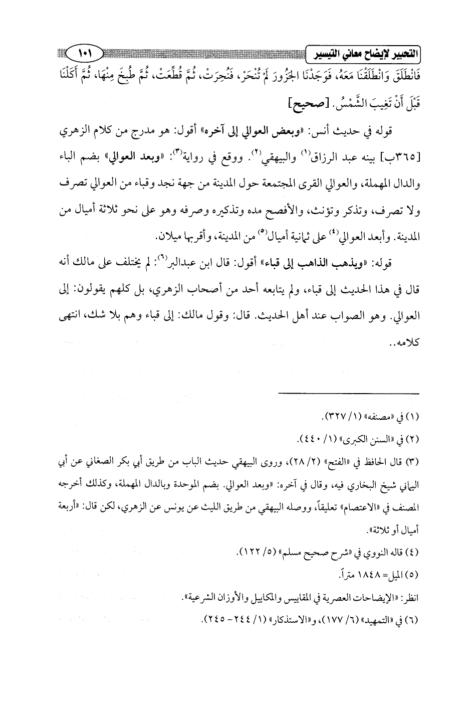 (¬3) قال الحافظ في "الفتح" (2/ 28)، وروى البيهقي حديث الباب من طريق أبي بكر الصغاني عن أبي اليماني شيخ البخاري فيه, وقال في آخره: "وبعد العوالي. بضم الموحدة وبالدال المهملة، وكذلك أخرجه المصنف في "الاعتصام" تعليقاً، ووصله البيهقي من طريق الليث عن يونس عن الزهري، لكن قال: "أربعة أميال أو ثلاثة".