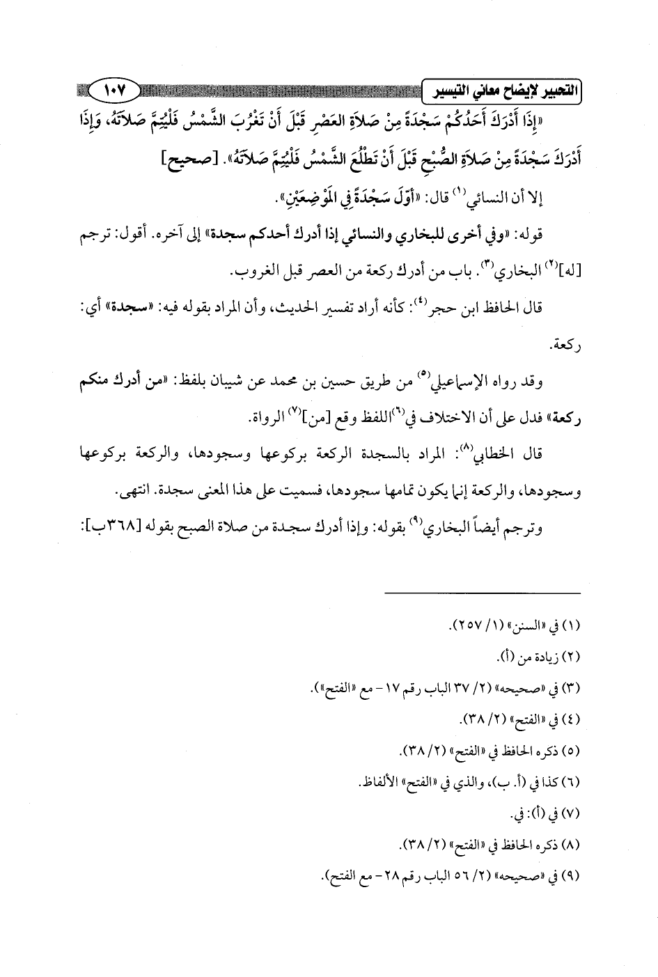 قوله: "وفي أخرى للبخاري والنسائي إذا أدرك أحدكم سجدة" إلى آخره. أقول: ترجم [له] (¬2) البخاري (¬3). باب من أدرك ركعة من العصر قبل الغروب.