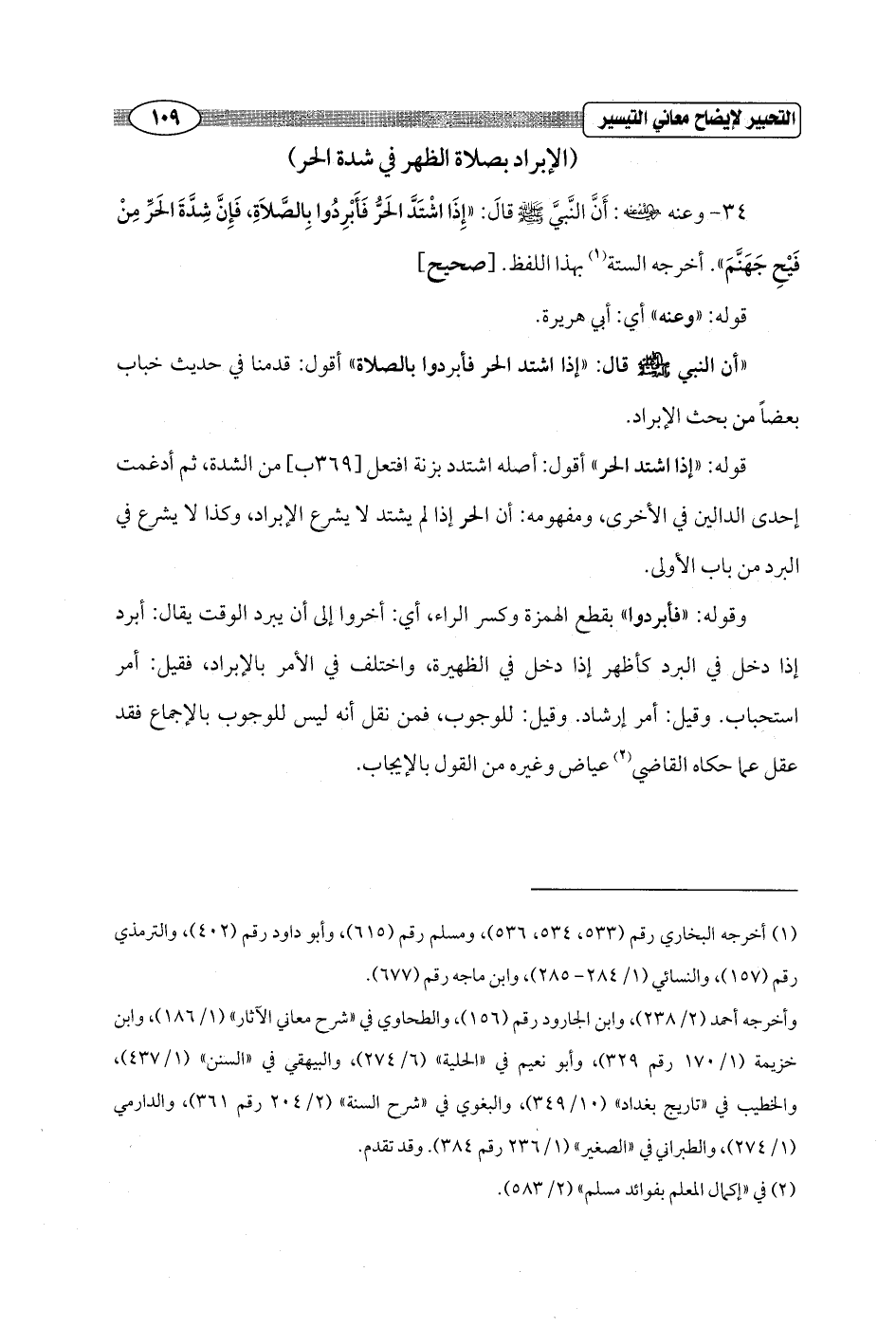 34 - وعنه - رضي الله عنه -: أَنَّ النَّبيَّ - صلى الله عليه وسلم - قَالَ: "إِذَا اشْتَدَّ الحَرُّ فَأَبْرِدُوا بِالصَّلاَةِ، فَإِنَّ شِدَّةَ الحَرِّ مِنْ فَيْحِ جَهَنَّمَ". أخرجه الستة (¬1) بهذا اللفظ. [صحيح]