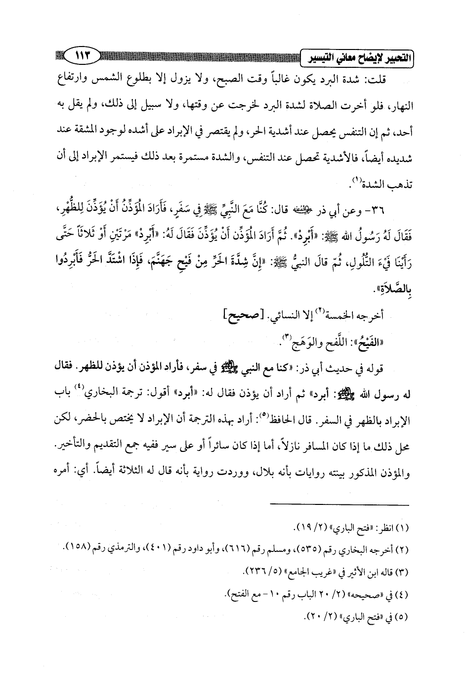 36 - وعن أبي ذر - رضي الله عنه - قال: كُنَّا مَعَ النَّبِيِّ - صلى الله عليه وسلم - فِي سَفَرٍ، فَأَرَادَ ألمُؤَذِّنُ أَنْ يُؤَذِّنَ لِلظُّهْرِ، فَقَالَ لَهُ رَسُولُ الله - صلى الله عليه وسلم -: "أَبْرِدْ". ثُمَّ أَرَادَ المُؤَذِّن أَنْ يُؤَذِّنَ فَقَالَ لَهُ: "أَبْرِدْ" مَرْتَيْنِ أَوْ ثَلاثَاً حَتَّى رَأَيْنَا فَيْءَ التُّلُولِ، ثُمّ قَالَ النبيُّ - صلى الله عليه وسلم -: "إِنَّ شِدَّةَ الحَر مِنْ فَيْحِ جَهَنَّمَ, فَإِذَا اشْتَدَّ الحَرُّ فَأَبْرِدُوا بِالصَّلاَةِ".