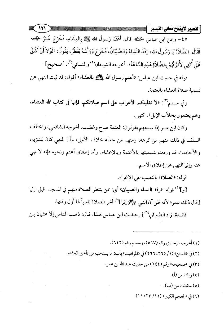 45 - وعن ابن عباس - رضي الله عنهما - قال: أَعْتَمَ رَسولَ الله - صلى الله عليه وسلم - بِالعِشَاءِ، فَخَرَجَ عُمَرُ - رضي الله عنه - فَقَالَ: الصَّلاَةَ يَا رَسُولَ الله، رَقَدَ النِّسَاءُ وَالصِّبْيَانُ، فَخَرَجَ وَرَأْسُهُ يَقْطُرُ، يَقُولُ: "لَوْلاَ أَنْ أَشُقَّ عَلَى أُمَّتِي لأَمَرْتُهُمْ بِالصَّلاَةِ هَذِهِ السَّاعَةَ". أخرجه الشيخان (¬1) والنسائي (¬2). [صحيح]