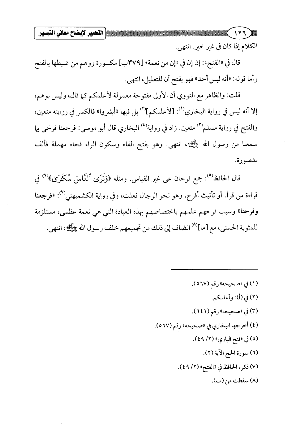 قلت: والظاهر مع النووي أن الأولى مفتوحة معمولة لأعلمكم كما قال، وليس بوهم، إلا أنه ليس في رواية البخاري (¬1): [لأعلمكم] (¬2) بل فيها "أبشروا" فالكسر في روايته متعين، والفتح في رواية مسلم (¬3) متعين. زاد في رواية (¬4) البخاري قال أبو موسى: فرجعنا فرحى بما سمعنا من رسول الله - صلى الله عليه وسلم -، انتهى. وهو بفتح الفاء وسكون الراء فحاء مهملة فألف مقصورة.