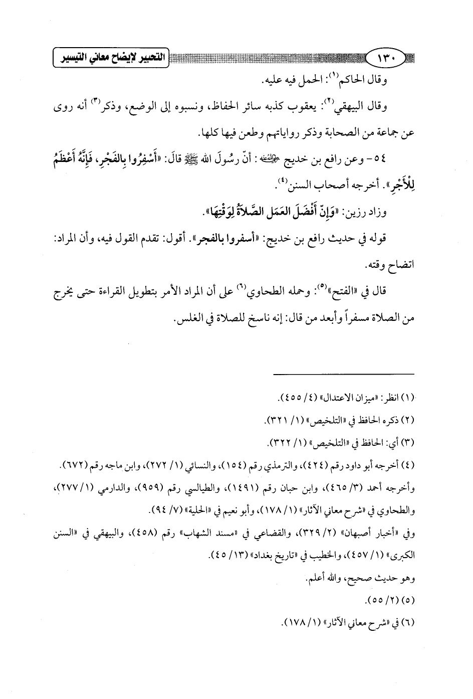 54 - وعن رافع بن خديج - رضي الله عنه -: أنّ رسُولَ الله - صلى الله عليه وسلم - قَالَ: "أَسْفِرُوا بِالفَجْرِ، فَإِنَّهُ أَعْظَمُ لِلْأَجْرِ". أخرجه أصحاب السنن (¬4).