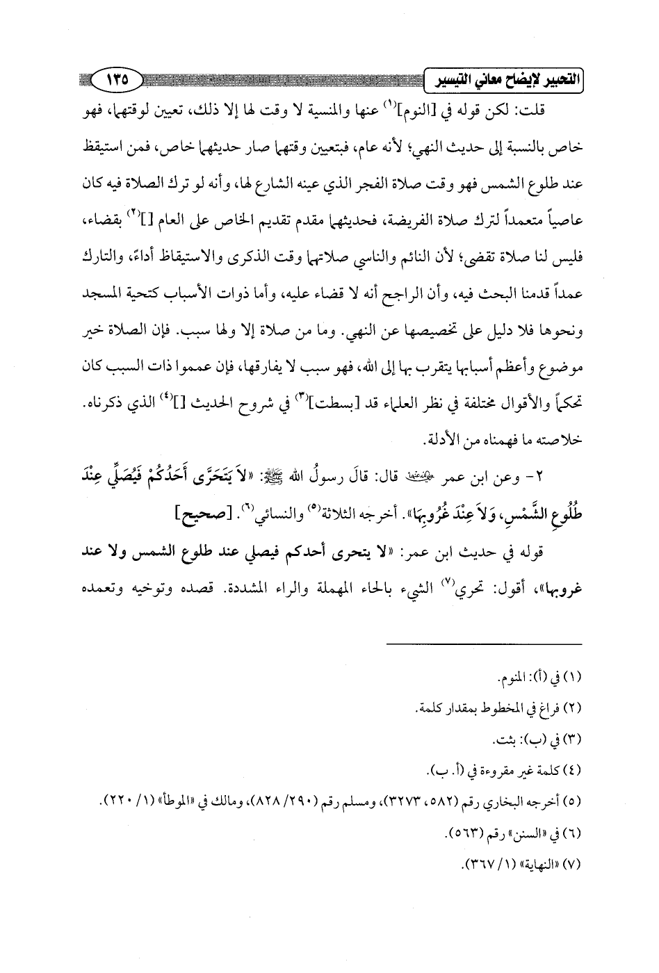 قوله في حديث ابن عمر: "لا يتحرى أحدكم فيصلي عند طلوع الشمس ولا عند غروبها"، أقول: تحري (¬7) الشيء بالحاء المهملة والراء المشددة. قصده وتوخيه وتعمده