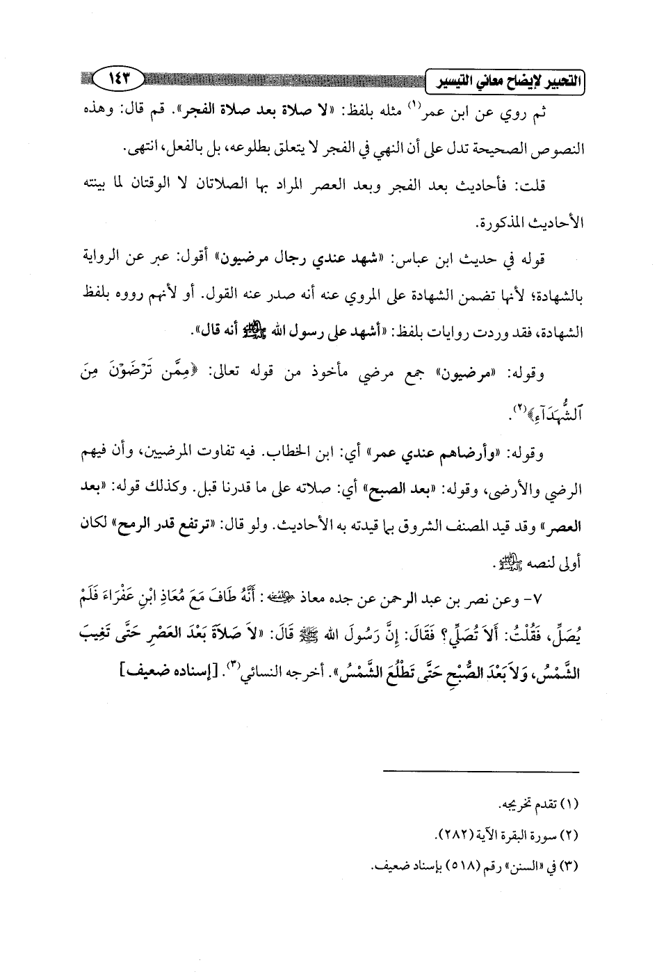 7 - وعن نصر بن عبد الرحمن عن جده معاذ - رضي الله عنه -: أنَّهُ طَافَ مَعَ مُعَاذِ ابْنِ عَفْرَاءَ فَلَمْ يُصَلِّ، فَقُلْتُ: أَلاَ تُصَلَّي؟ فَقَالَ: إِنَّ رَسُولَ الله - صلى الله عليه وسلم - قَالَ: "لاَ صَلاَةَ بَعْدَ العَصْرِ حَتَّى تَغِيبَ الشّمْسُ، وَلاَ بَعْدَ الصُّبْحِ حَتَّى تَطْلُعَ الشَّمْسُ". أخرجه النسائي (¬3). [إسناده ضعيف]
