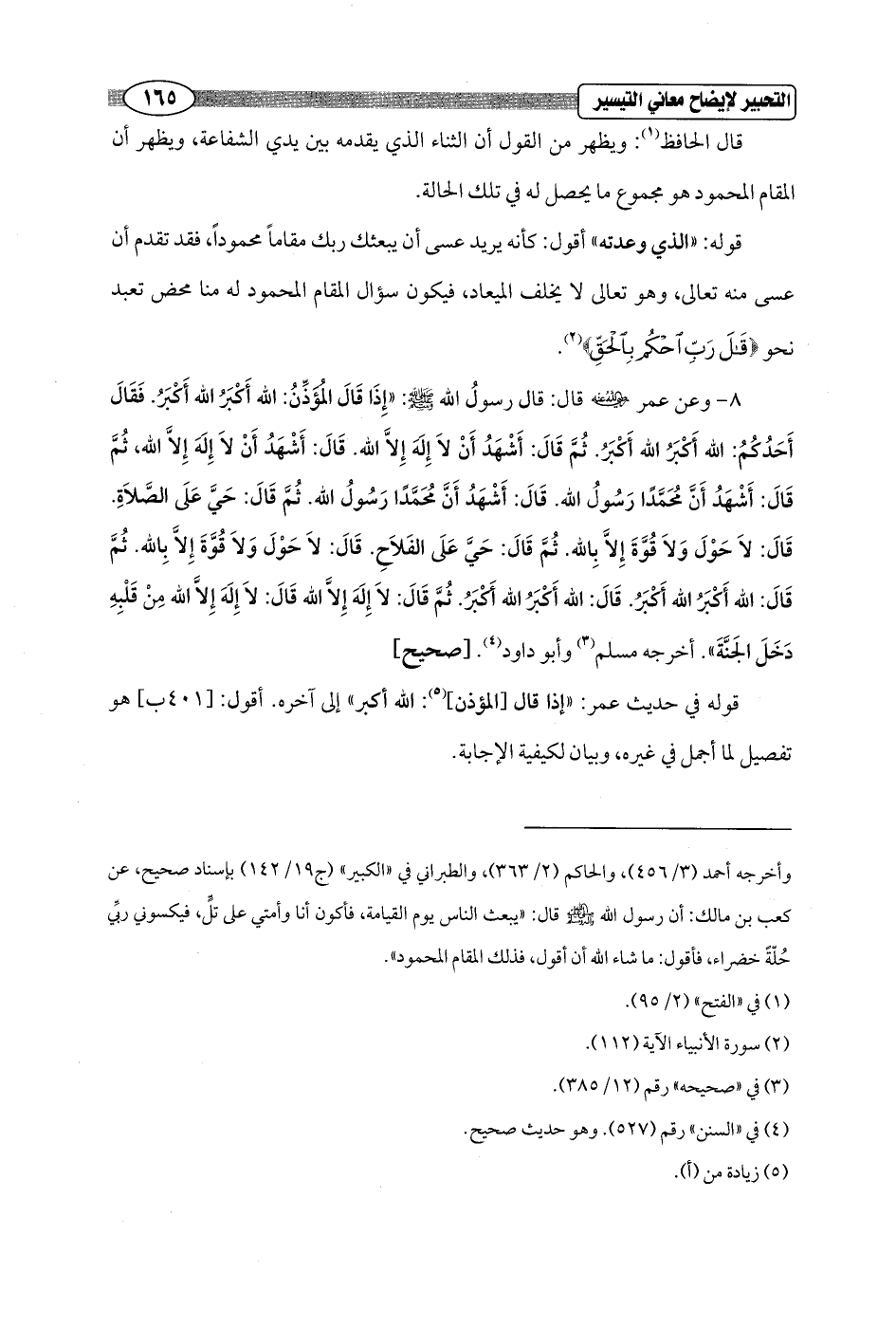 = وأخرجه أحمد (3/ 456)، والحاكم (2/ 363)، والطبراني في "الكبير" (ج 19/ 142) بإسناد صحيح، عن كعب بن مالك: أن رسول الله - صلى الله عليه وسلم - قال: "يبعث الناس يوم القيامة، فأكون أنا وأمتي على تلًّ، فيكسوني ربِّي حُلّةً خضراء، فأقول: ما شاء الله أن أقول، فذلك المقام المحمود".
