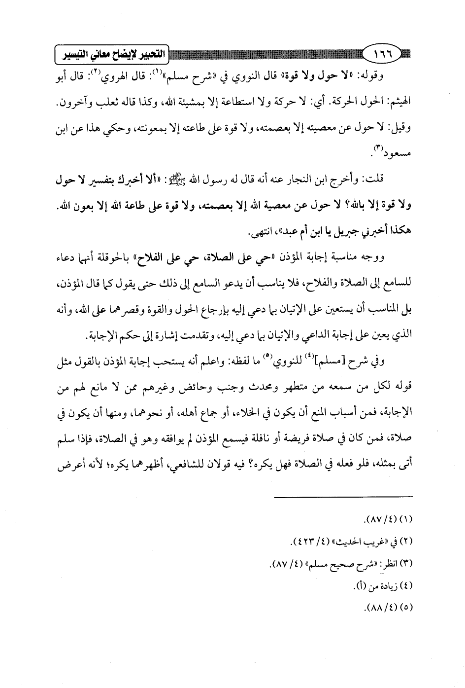 ووجه مناسبة إجابة المؤذن "حي على الصلاة, حي على الفلاح" بالحوقلة أنهما دعاء للسامع إلى الصلاة والفلاح، فلا يناسب أن يدعو السامع إلى ذلك حتى يقول كما قال المؤذن, بل المناسب أن يستعين على الإتيان بما دعي إليه بإرجاع الحول والقوة وقصرهما على الله، وأنه الذي يعين على إجابة الداعي والإتيان بما دعي إليه، وتقدمت إشارة إلى حكم الإجابة.