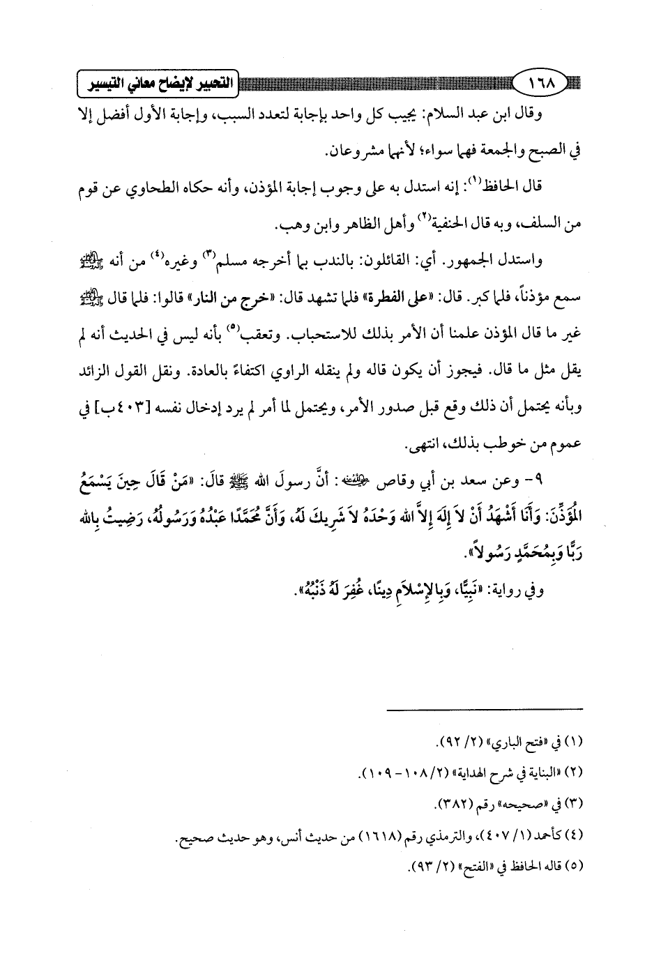 واستدل الجمهور. أي: القائلون: بالندب بما أخرجه مسلم (¬3) وغيره (¬4) من أنه - صلى الله عليه وسلم - سمع مؤذناً، فلما كبر. قال: "على الفطرة" فلما تشهد قال: "خرج من النار" قالوا: فلما قال - صلى الله عليه وسلم - غير ما قال المؤذن علمنا أن الأمر بذلك للاستحباب. وتعقب (¬5) بأنه ليس في الحديث أنه لم يقل مثل ما قال. فيجوز أن يكون قاله ولم ينقله الراوي اكتفاءً بالعادة. ونقل القول الزائد وبأنه يحتمل أن ذلك وقع قبل صدور الأمر، ويحتمل لما أمر لم يرد إدخال نفسه [403 ب] في عموم من خوطب بذلك، انتهى.