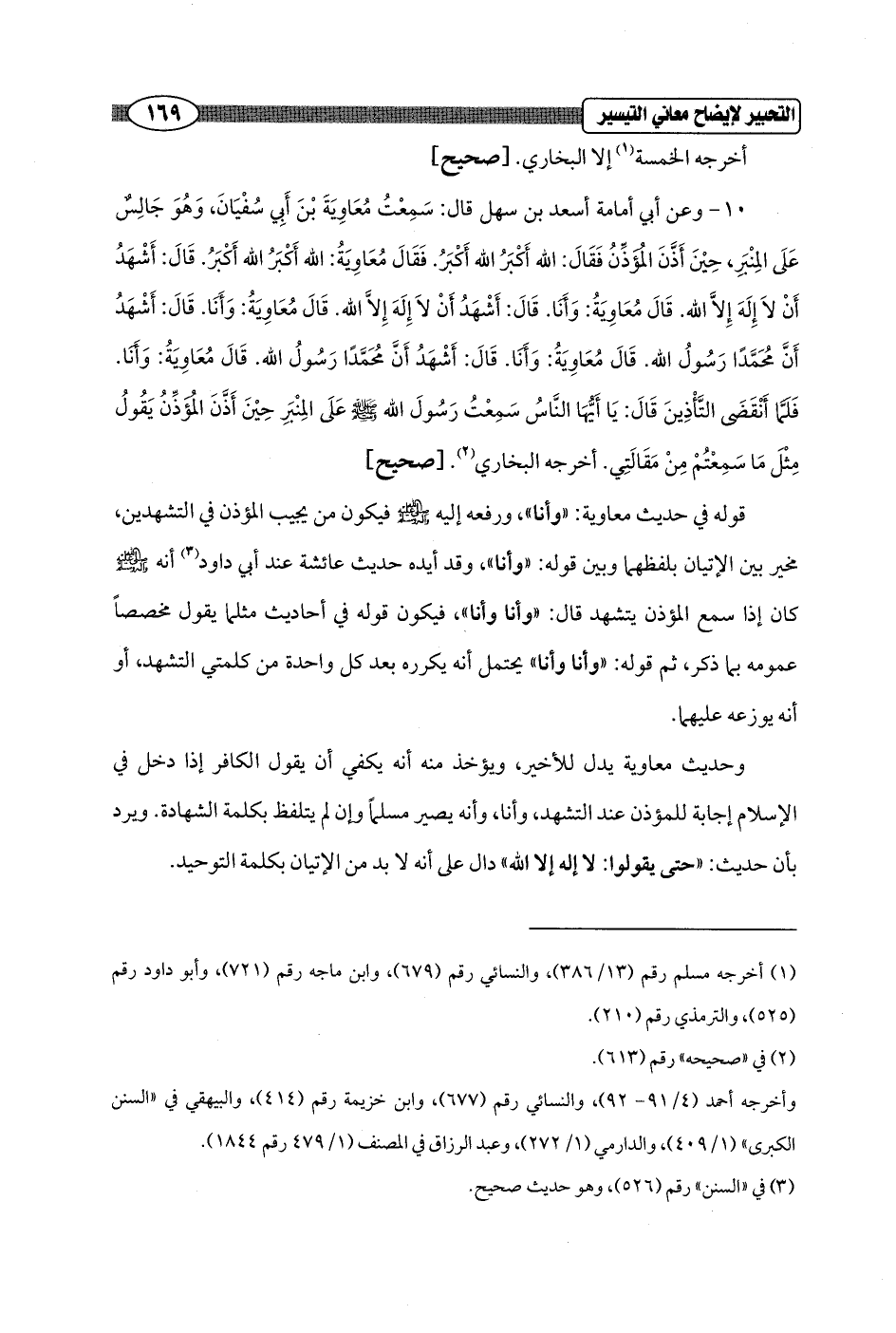 وحديث معاوية يدل للأخير، ويؤخذ منه أنه يكفي أن يقول الكافر إذا دخل في الإسلام إجابة للمؤذن عند التشهد، وأنا، وأنه يصير مسلماً وإن لم يتلفظ بكلمة الشهادة. ويرد بأن حديث: "حتى يقولوا: لا إله إلا الله" دال على أنه لا بد من الإتيان بكلمة التوحيد.